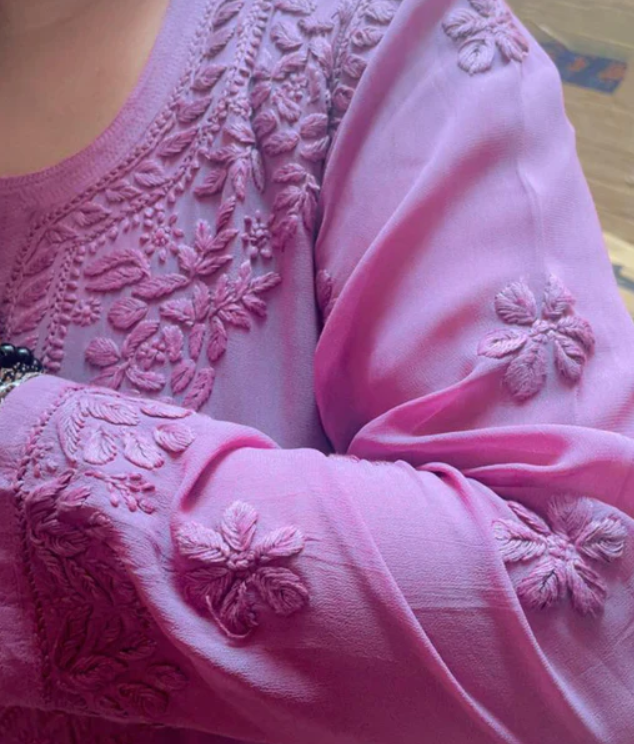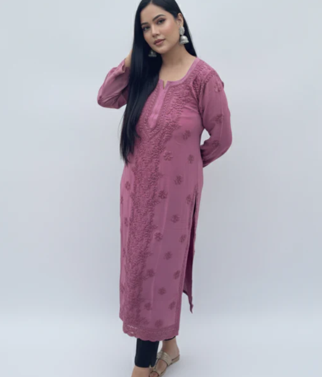 Experience timeless elegance with the NITYA Mauve Pure Viscose Chikankari Omray Kurti, a beautifully handcrafted piece that celebrates the rich artistry of handmade Lucknowi Chikankari from Lucknow . Intricately designed with fine 3D emboss hand embroidery across the front, this kurti reflects exceptional craftsmanship and refined ethnic luxury.