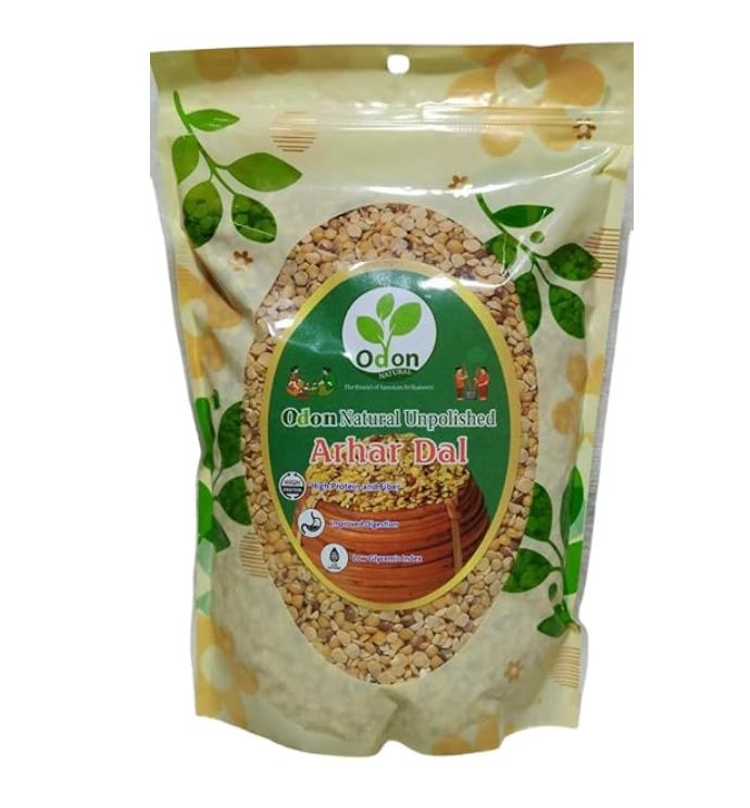 Enjoy the natural goodness of ODON NATURAL High Protein Unpolished Arhar Dal, a premium organic lentil ideal for health-conscious consumers, vegetarians, and fitness enthusiasts. Hand-pounded and stone-ground, this dal retains maximum nutrition, including high protein, dietary fibber, and essential minerals. With its low glycaemic index, it’s perfect for a balanced diet and supports digestion and overall wellness. Free from chemicals, preservatives, and artificial colours, it comes in a transparent resealable pouch, ensuring freshness and convenience for your daily cooking needs. Elevate your meals with the wholesome, natural flavour of this premium arhar dal.