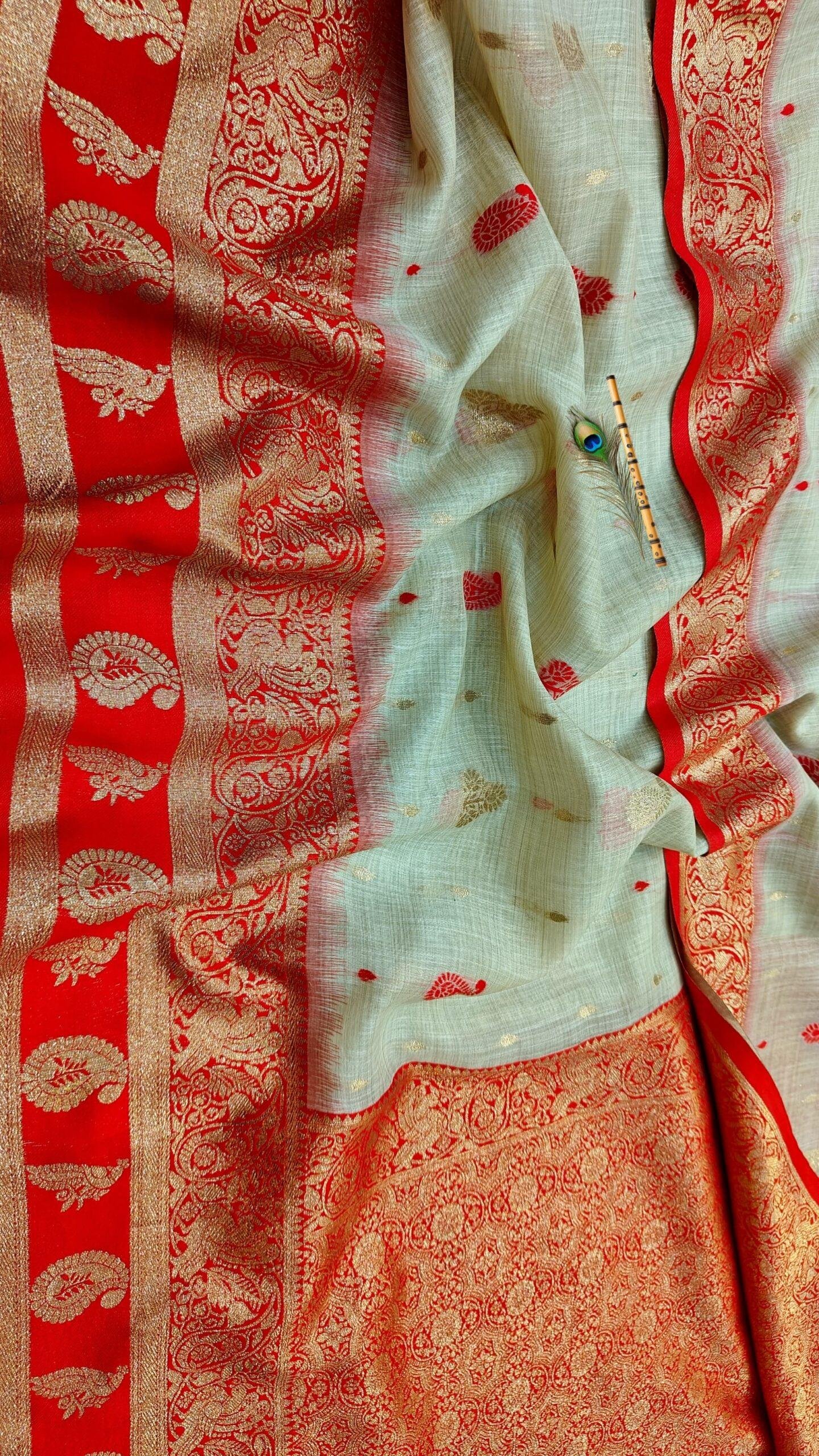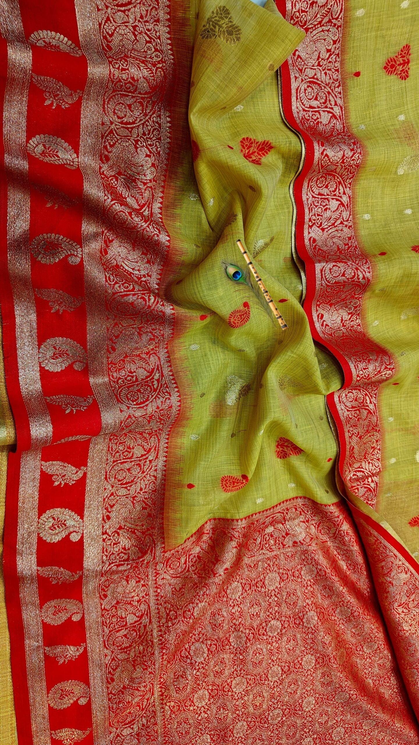 Color: Olive Pastel Body with Red & Gold Zari Border