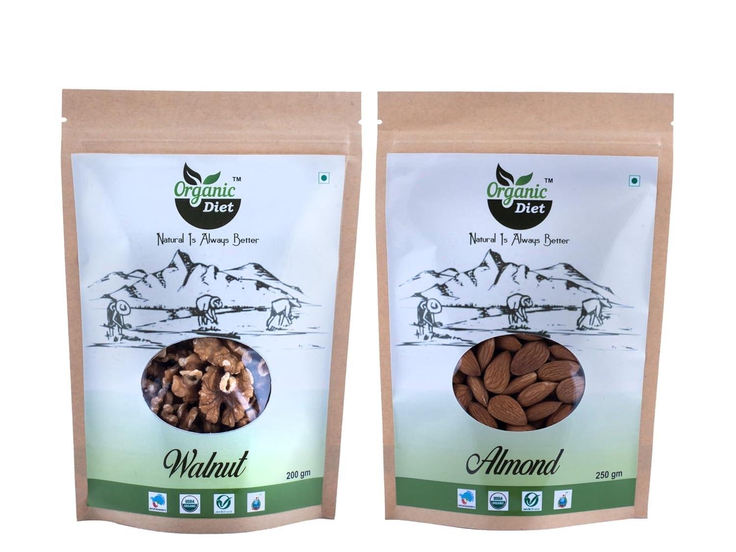 Organic Diet Almond (250g) & Walnut (200g) Combo Pack | Premium Natural Badam & Akhrot | Healthy Dry Fruits | Protein-Rich Nuts for Daily Snacking