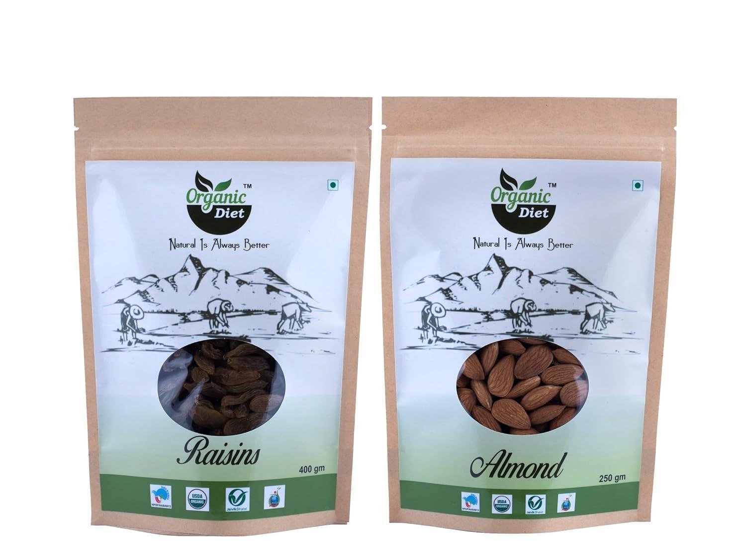 Organic Diet Almonds & Raisins Combo – 650g | Premium Badam & Kishmish | Natural Whole Dry Fruits | No Preservatives | Resealable Pack