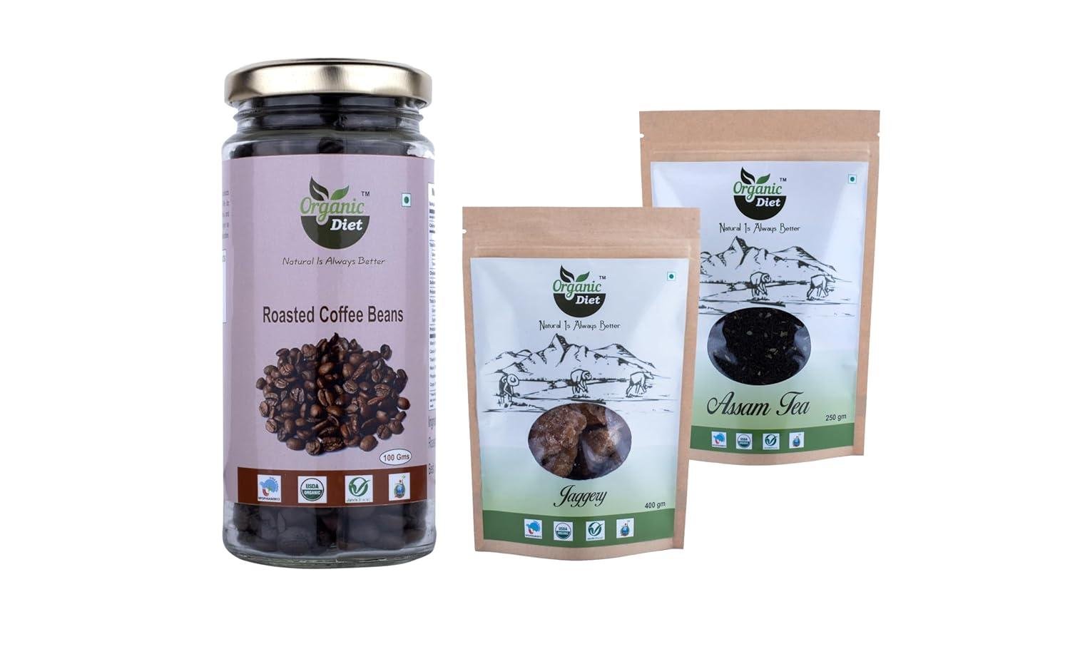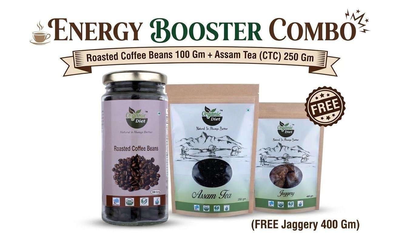 Organic Diet Energy Booster Combo – Roasted Coffee Beans (100g) + Assam Tea CTC (250g) with FREE Jaggery (400g) | Natural Daily Beverage Combo