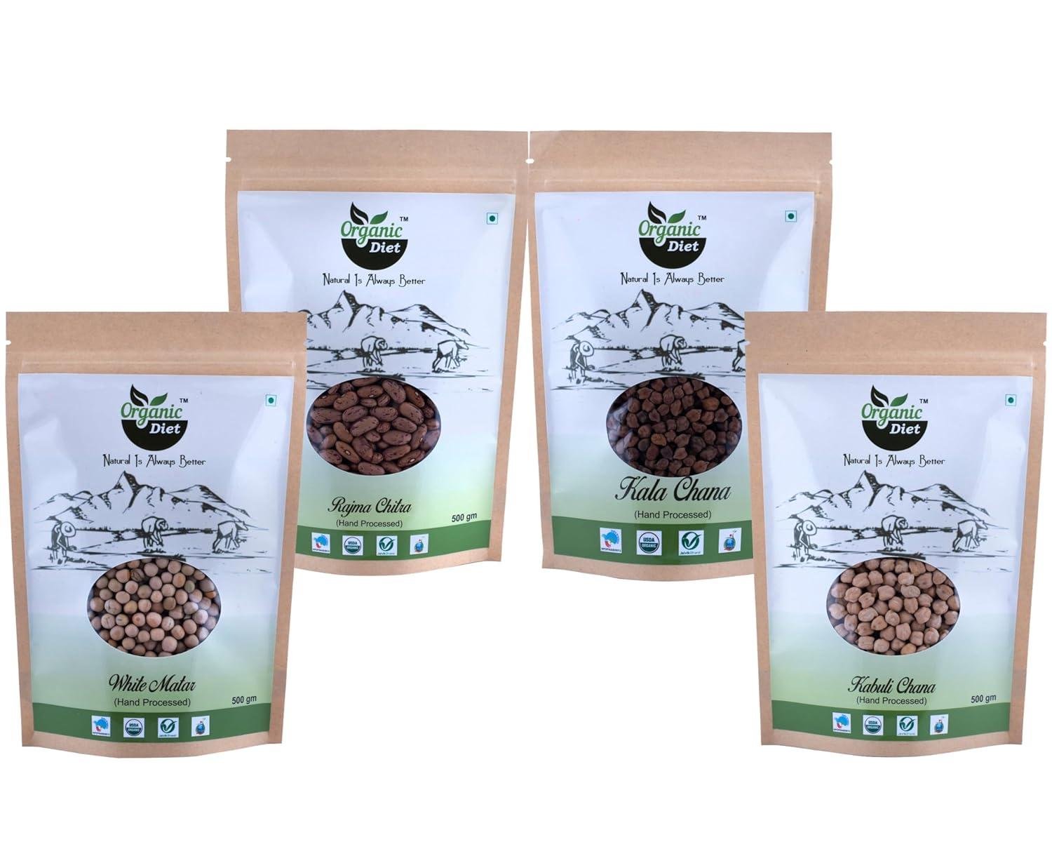 Organic Diet Protein Rich Legumes Combo – White Peas, Kabuli Chana, Kala Chana & Rajma Chitra (500g Each) | Unpolished, Hand Processed Whole Pulses