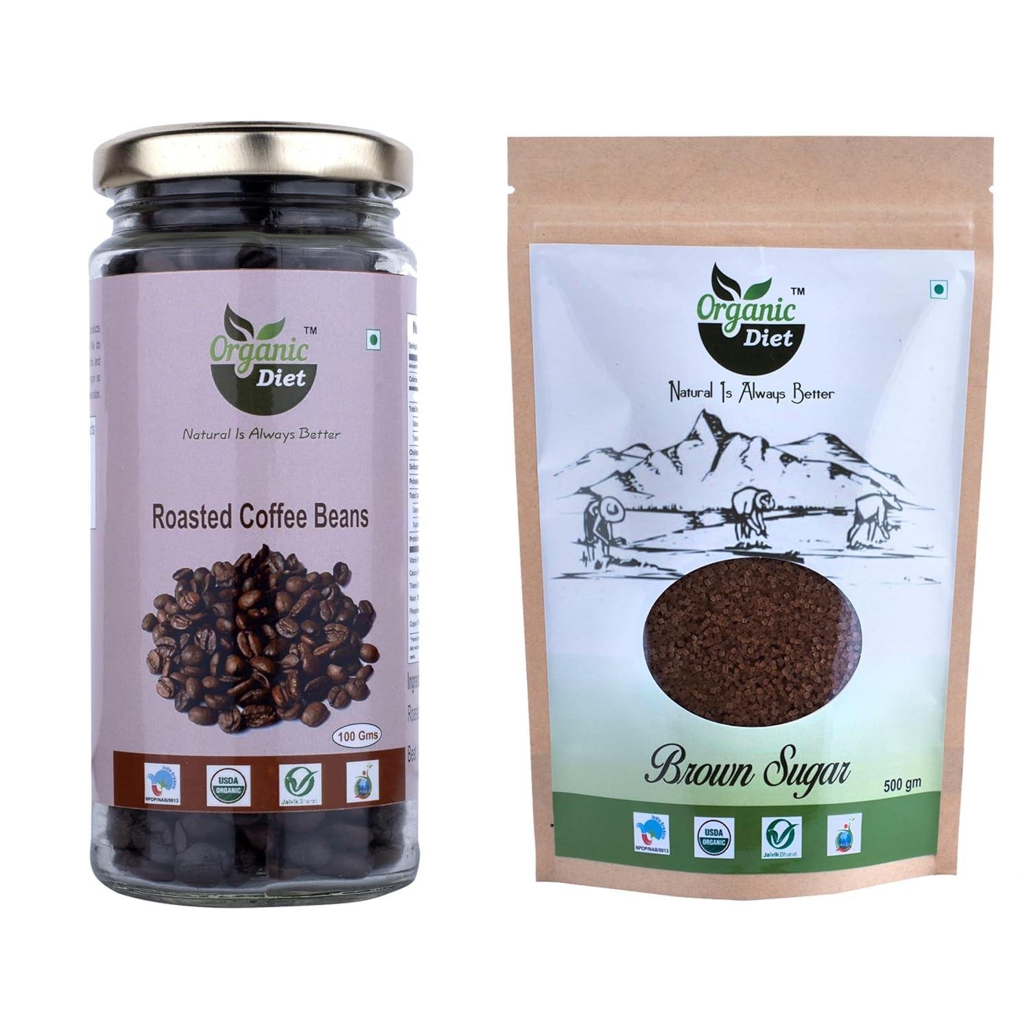 Organic Diet Roasted Coffee Beans 100g + Brown Sugar 500g | Natural Coffee & Sweetener Combo | Slow Roasted Beans | Unrefined Brown Sugar | FSSAI Licensed