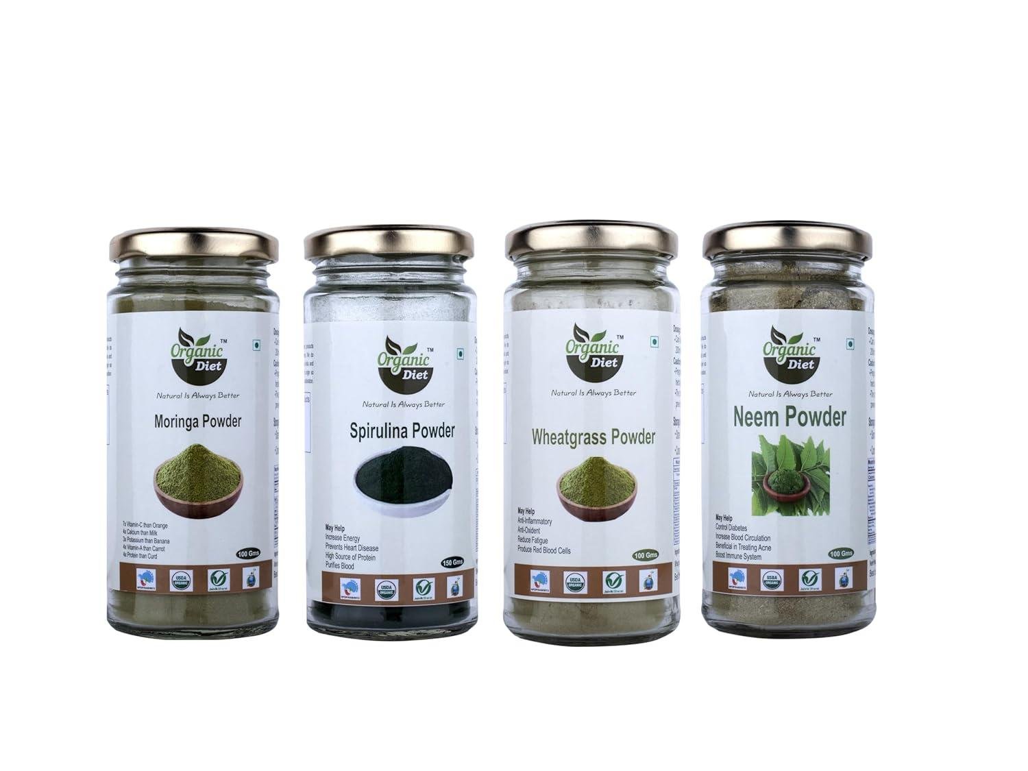 Organic Diet Super Green Detox Combo – Moringa, Wheatgrass & Spirulina (100g Each) | Free Neem Powder | Daily Green Superfood Powder for Smoothies, Juices & Healthy Recipes