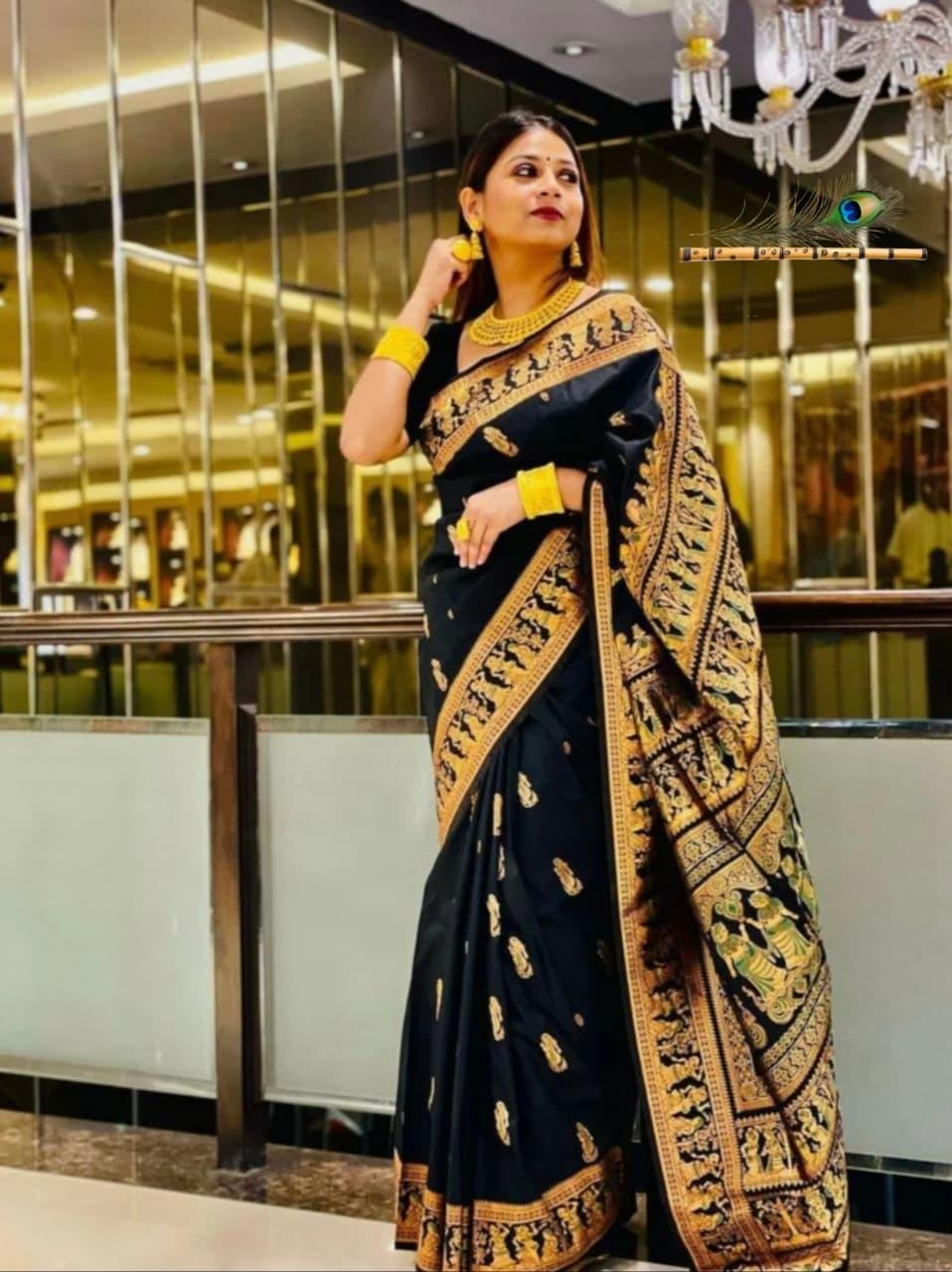 Soft silk saree featuring a rich woven pallu, traditional Baluchuri motifs, and intricate Meena detailing throughout the body.
