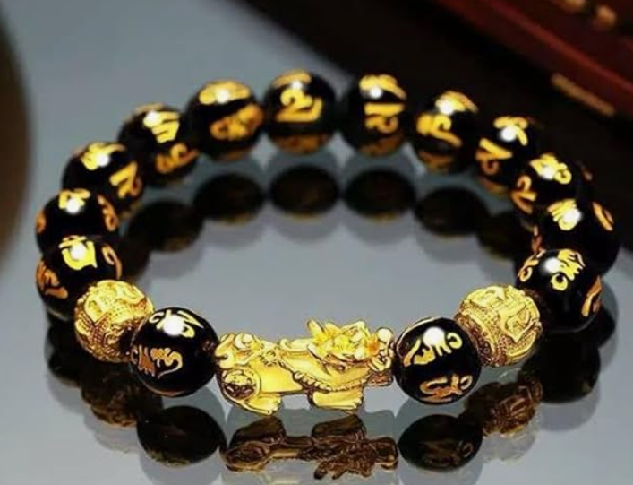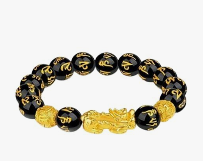 - AUTHENTIC DESIGN: Black obsidian beads with golden Om Mani inscriptions and traditional Pixiu charm create an elegant feng shui bracelet