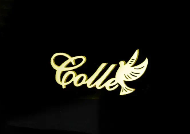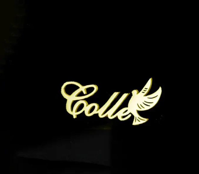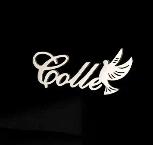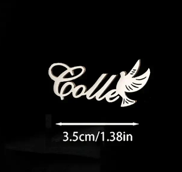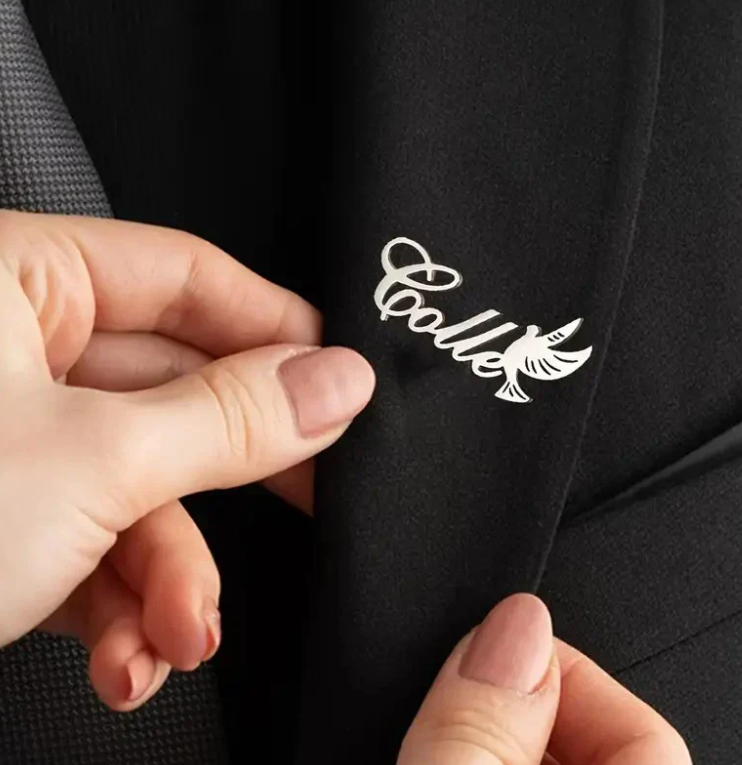 A beautifully crafted personalized dove name brooch, featuring a graceful dove in flight. This elegant piece is customized with a name, adding a meaningful and unique touch. Perfect for symbolizing peace and love, it’s a sophisticated accessory to elevate any look with a personal flair.
