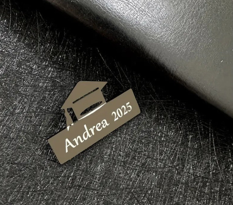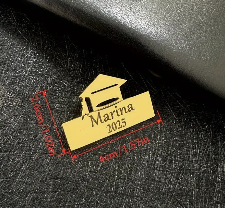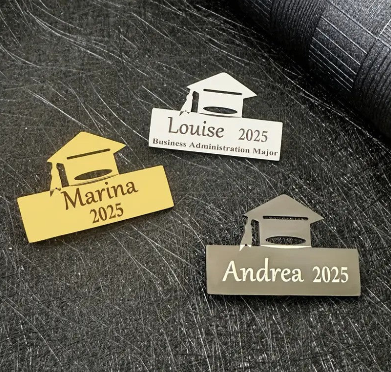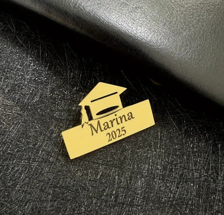 A personalized graduation brooch is a custom-designed accessory, typically featuring the graduate's name, graduation year, or a special symbol, to commemorate their achievement. It is often worn on graduation attire or displayed as a keepsake to celebrate the milestone. The brooch can be crafted in various styles, from elegant and simple to more intricate designs, making it a thoughtful and meaningful gift.