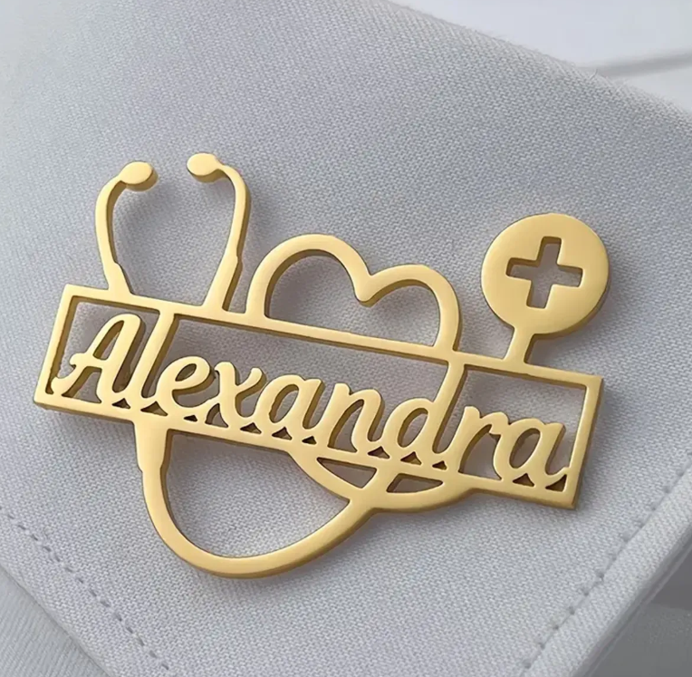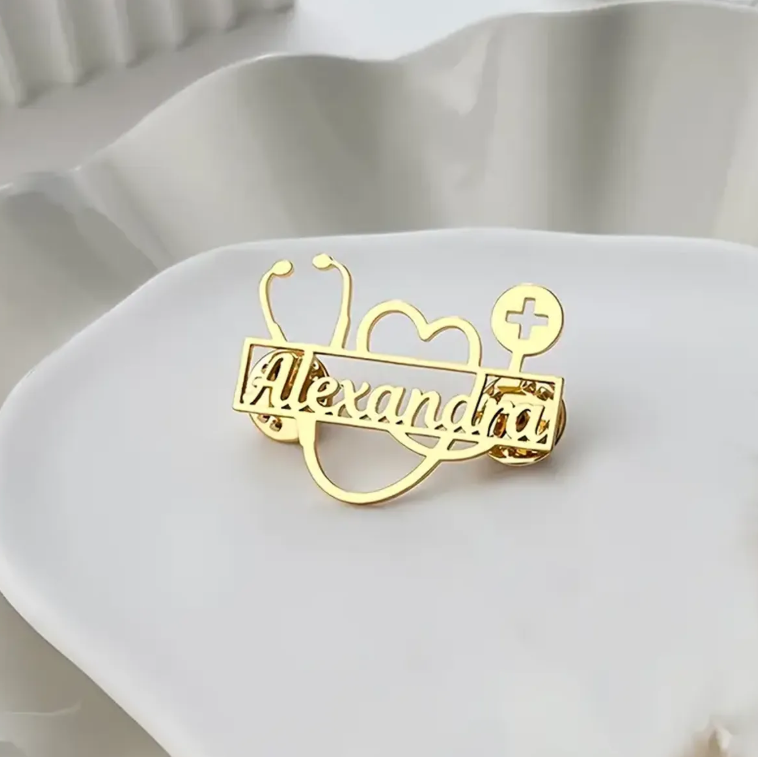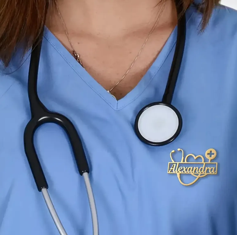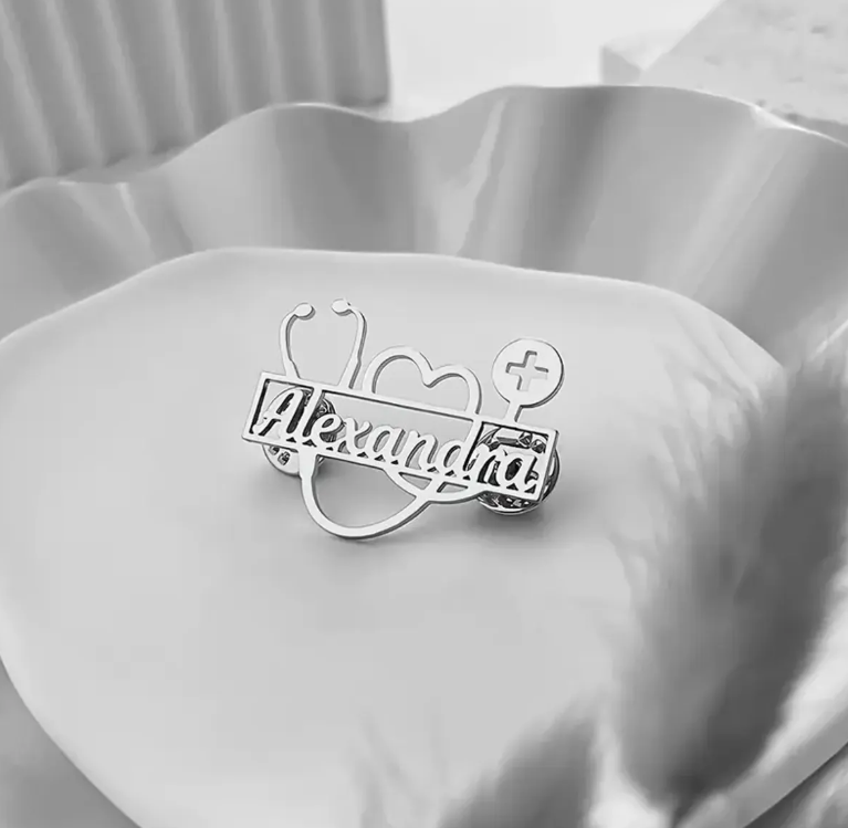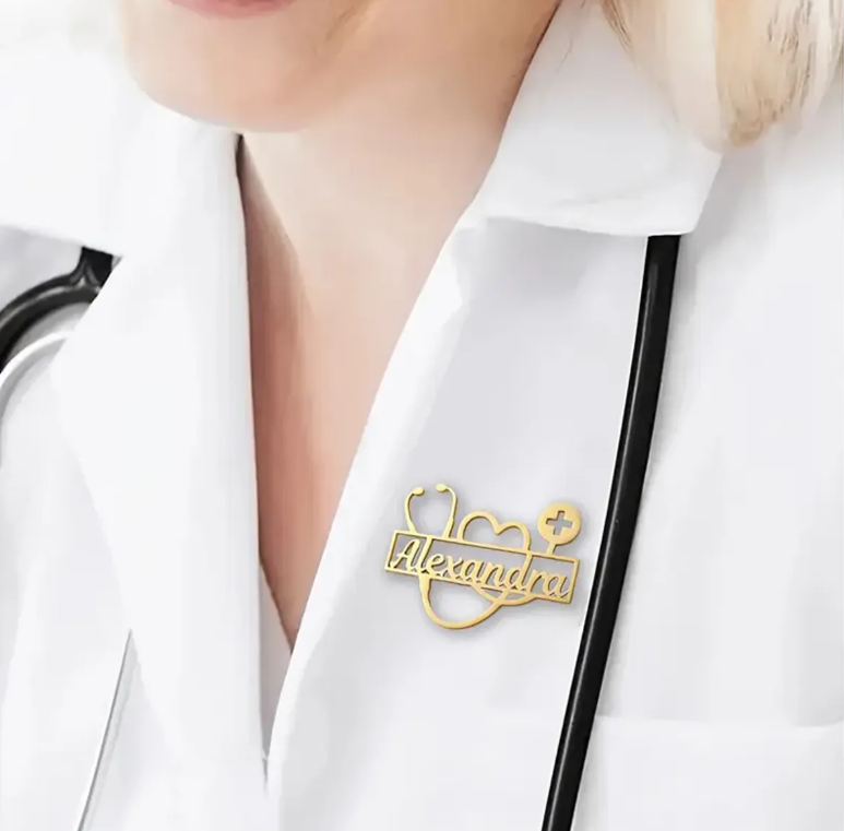 A Personalized Stethoscope Logo Name Brooch is a custom-designed accessory that features a stethoscope logo alongside a personalized name or initials. It's typically worn by medical professionals, such as doctors or nurses, as a stylish and functional way to showcase their identity. The brooch combines both professional symbolism and a personal touch, making it a unique and meaningful accessory for healthcare workers.