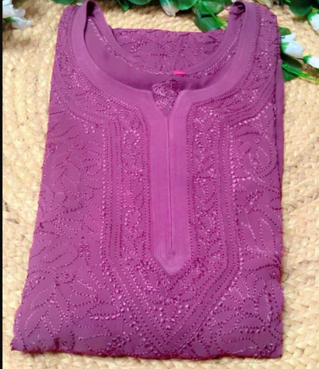 The wine-colored long viscose kurta is adorned with all-over floral Chikankari work and is thoughtfully paired with a matching palazzo, dupatta, and inner to complete a graceful and cohesive look. Elegant yet comfortable, this ensemble is perfect for festive occasions, celebrations, and special gatherings.