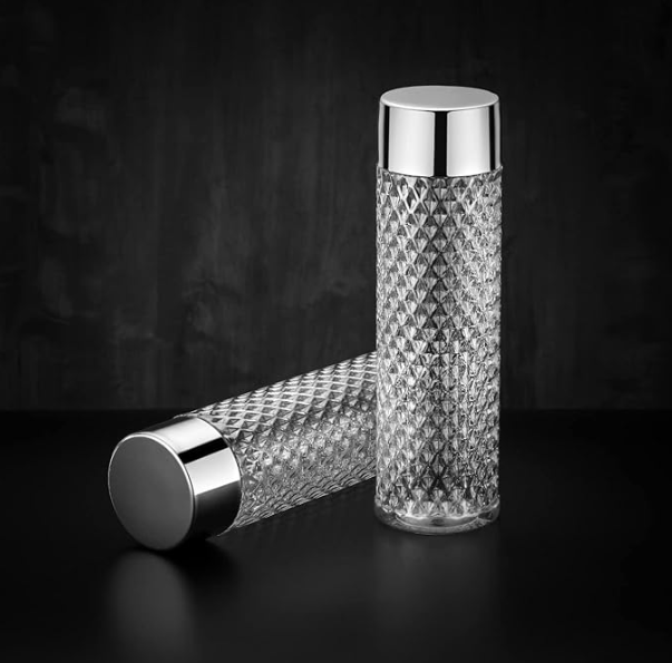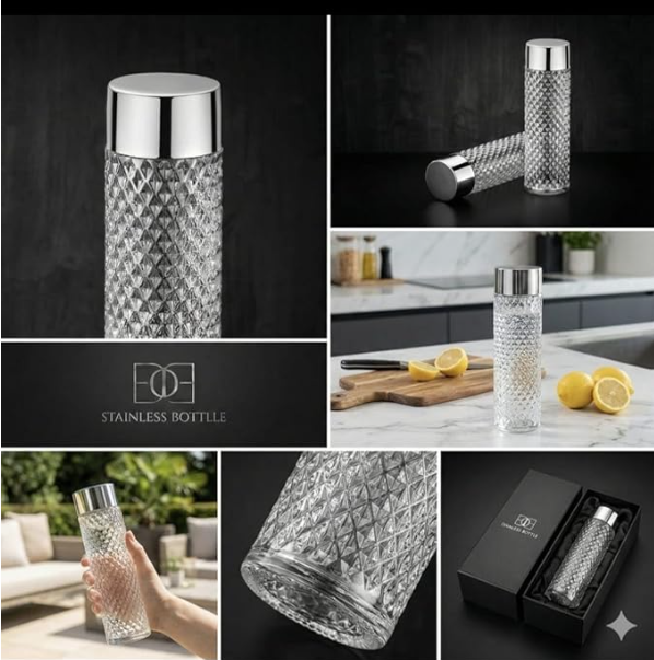 - PREMIUM DESIGN: Elegant diamond cut pattern glass water bottle with a stylish round steel cap, perfect for adding a touch of sophistication to your hydration routineÂ