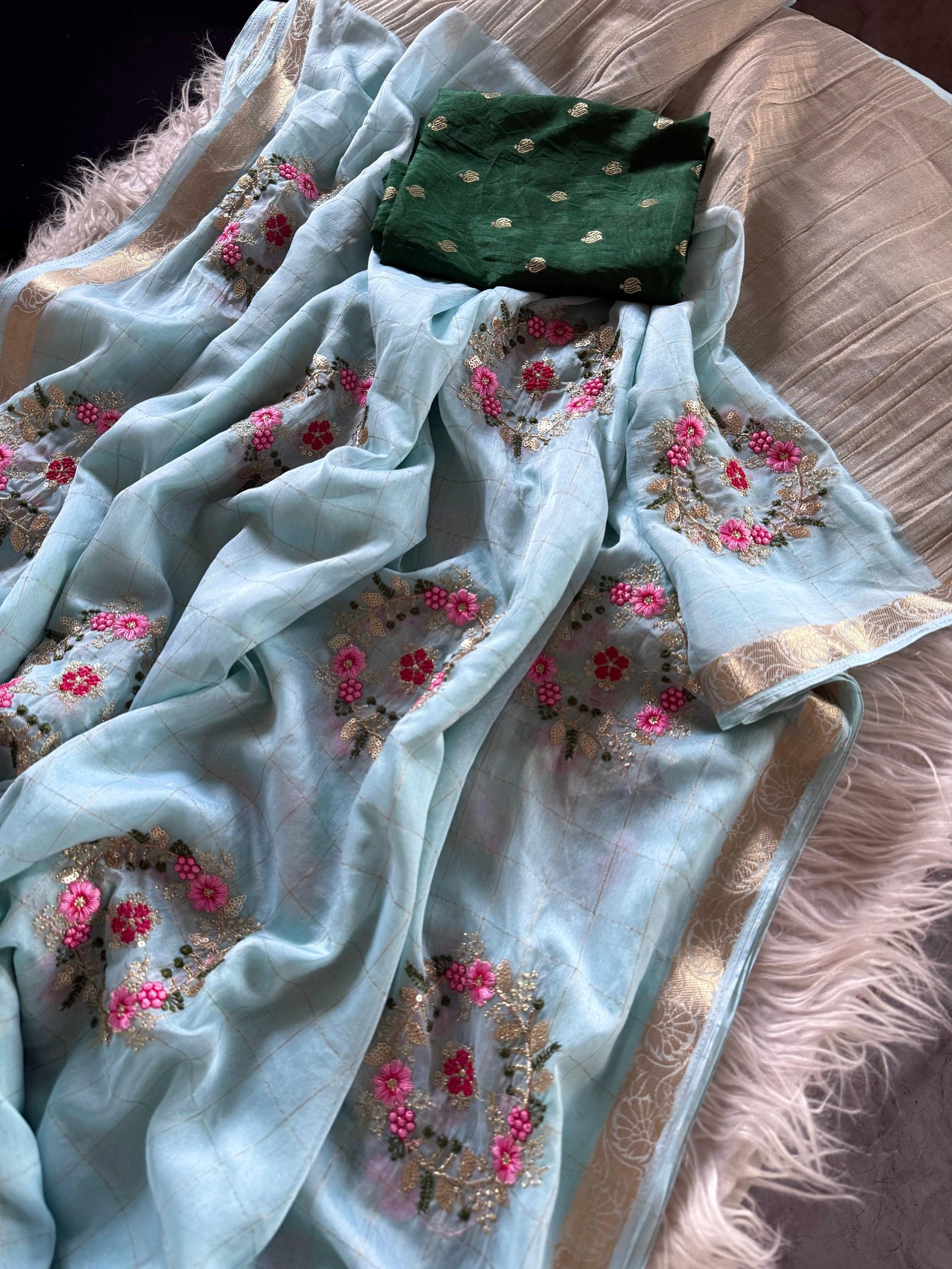 Pure chinnon Viscose Chex multi embroidery Sequence Saree With viscose Buti blouse