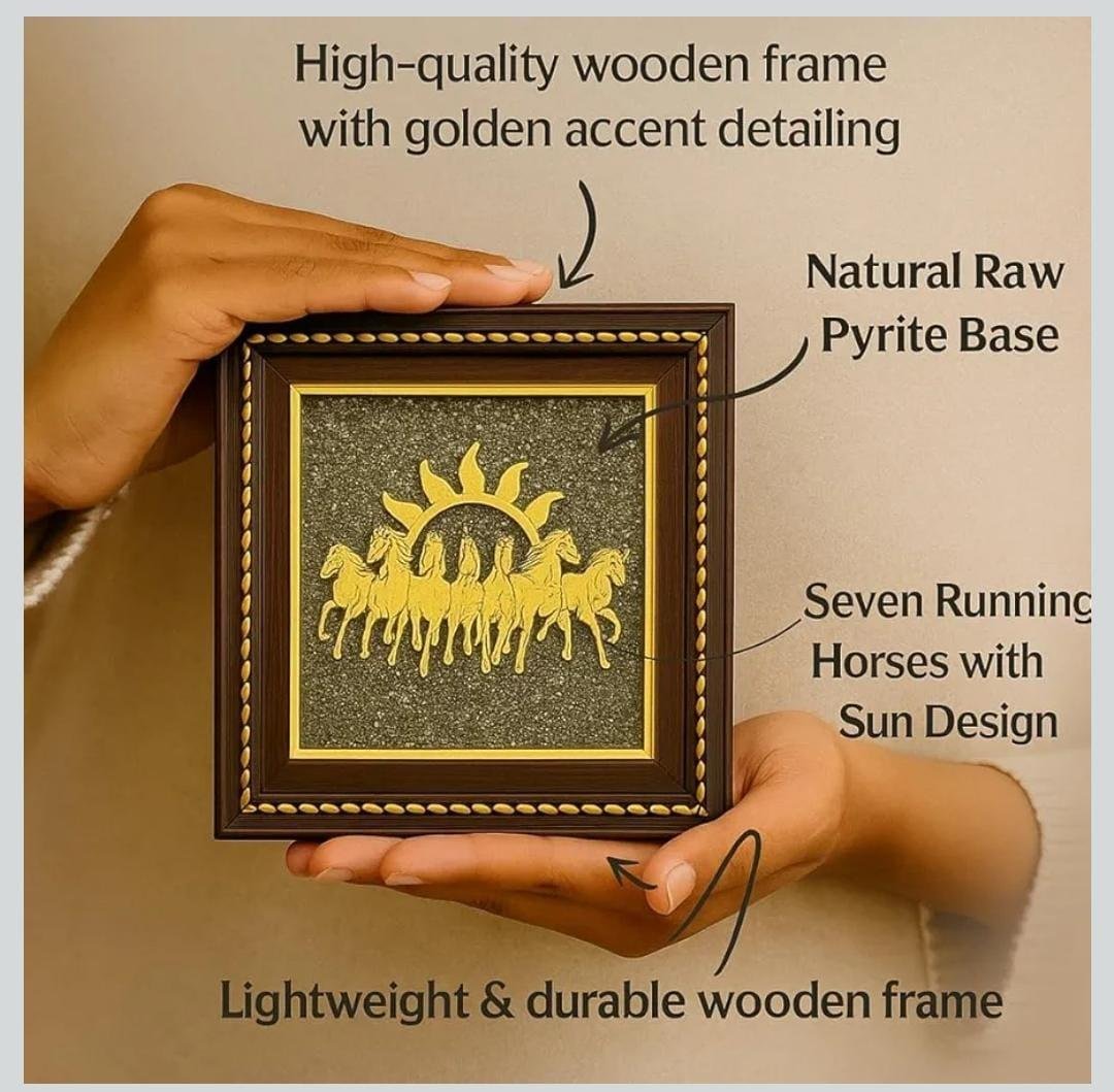 ELEGANT DESIGN: Gold-plated seven running horses artwork set against a shimmering pyrite dust background for Attracts Money and Boost Confidence, encased in a sophisticated dark wooden frame with golden border accents
