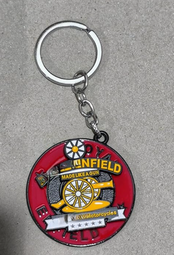 - DESIGN: Circular metal keychain featuring R-o-y-a-l-E-n-f-i-e-l-d motorcycle motif in vibrant red and yellow colours with detailed wheel designs