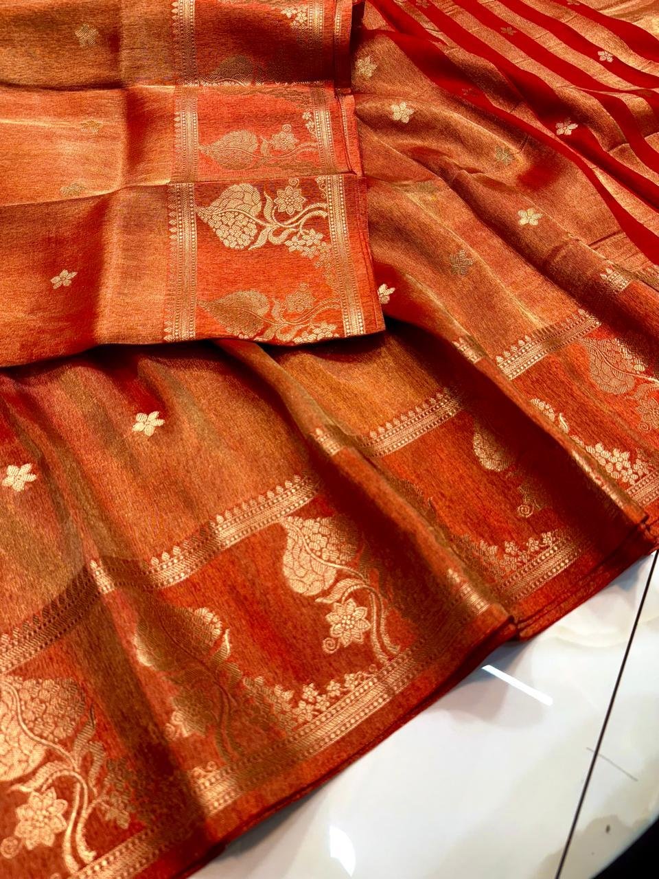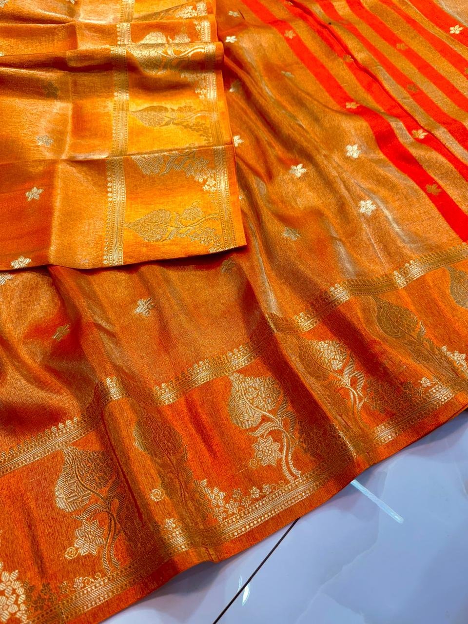 Radiant Marigold Orange Handwoven Tissue Banarasi Saree with Blouse – Golden Zari Elegance