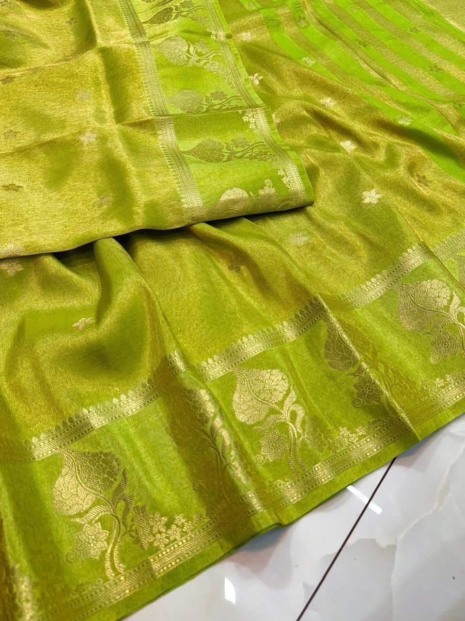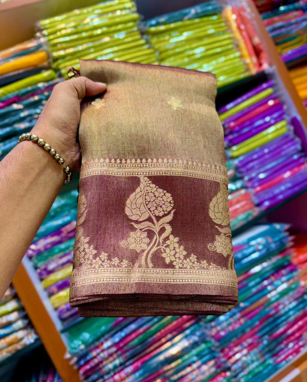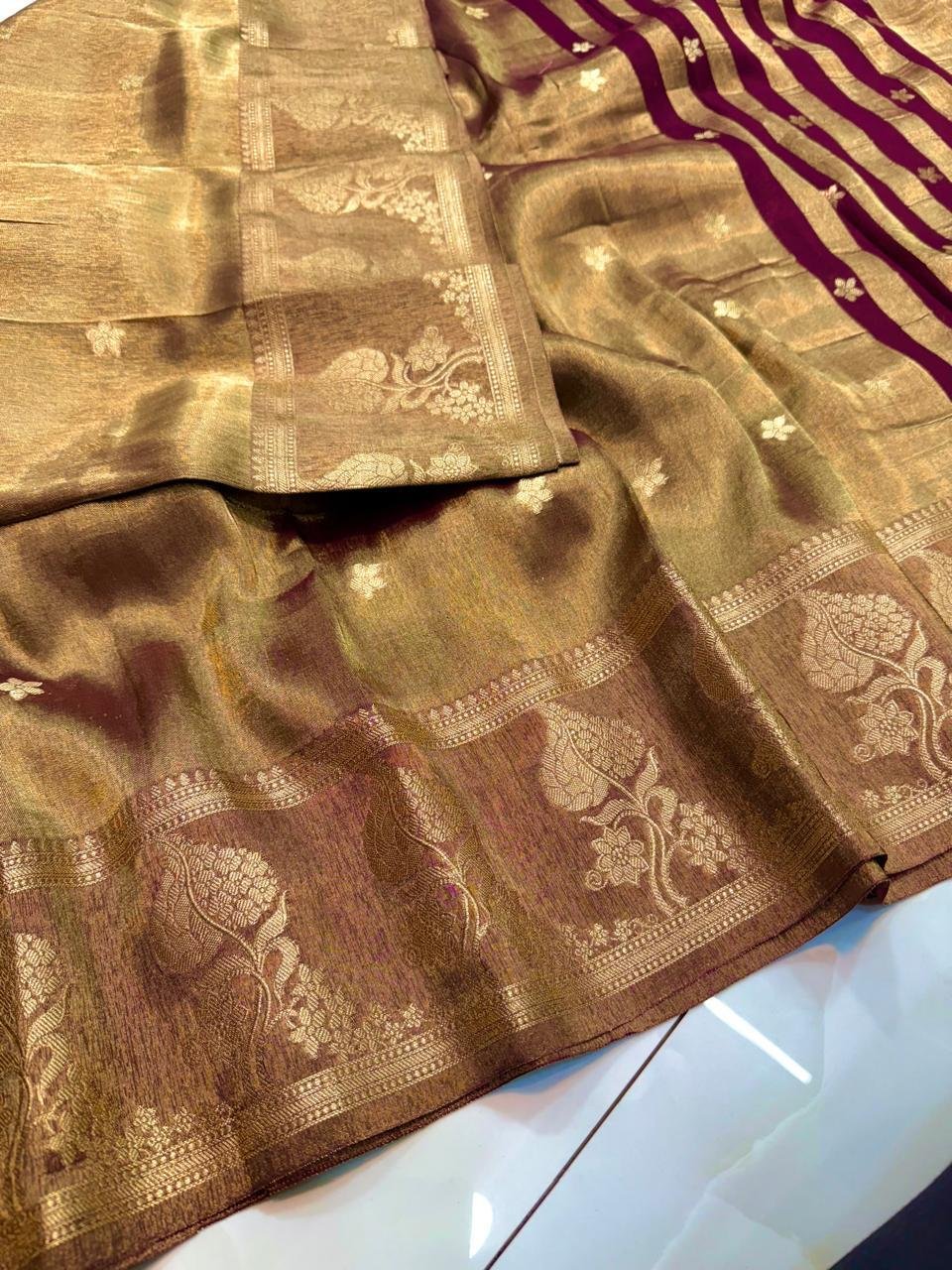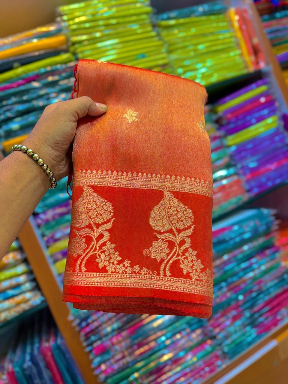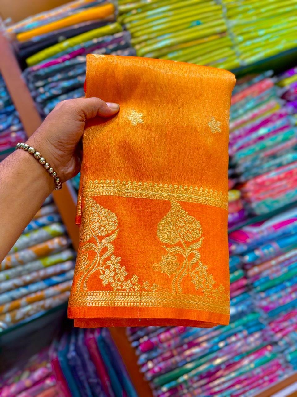Grace meets grandeur in this exquisite handcrafted tissue Banarasi saree, woven with fine craftsmanship and attention to detail. Drenched in a radiant marigold orange hue and adorned with luxurious gold zari floral motifs, this saree captures the essence of festive opulence. The luminous tissue silk fabric drapes beautifully, giving a regal and graceful silhouette. Perfect for weddings, festivals, and elegant gatherings.