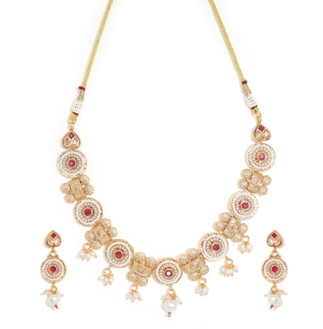 Rajwadi Polki Mina necklace Set With Ruby Stones And Gold Finish