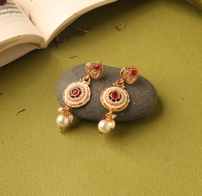 Step into royalty with this Rajwadi Polki Necklace Set, beautifully adorned with sparkling ruby stones and a rich gold finish. Designed in traditional Rajwadi style, the intricate Polki work and vibrant rubies exude elegance and grandeur. Perfect for weddings, festive occasions, and special celebrations, this necklace set elevates your ethnic look with a regal touch. Lightweight and comfortable, it pairs seamlessly with lehengas, sarees, and other traditional attire.