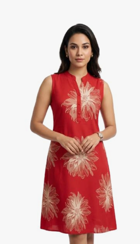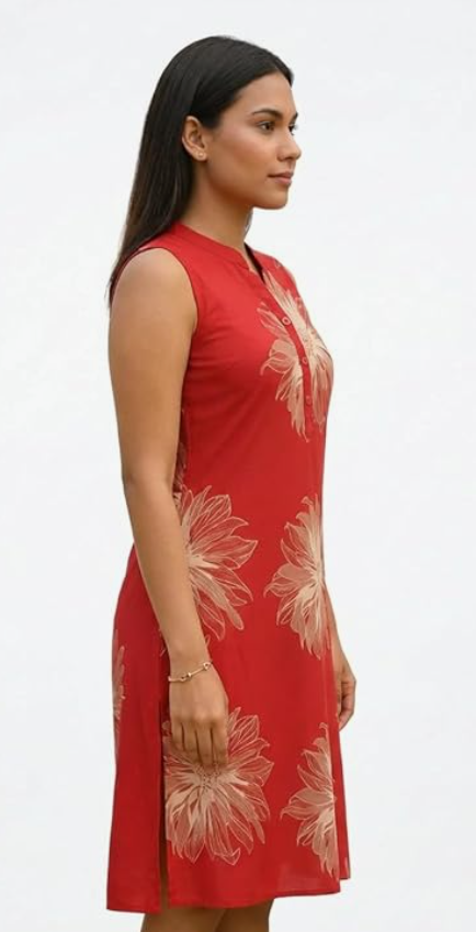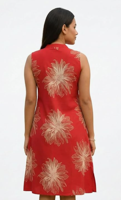 STYLEGENIXSTYLEGENIX Red Sleeveless Dress with Golden Floral Print, Mandarin Collar, A-Line Style