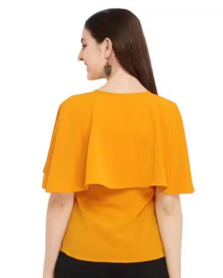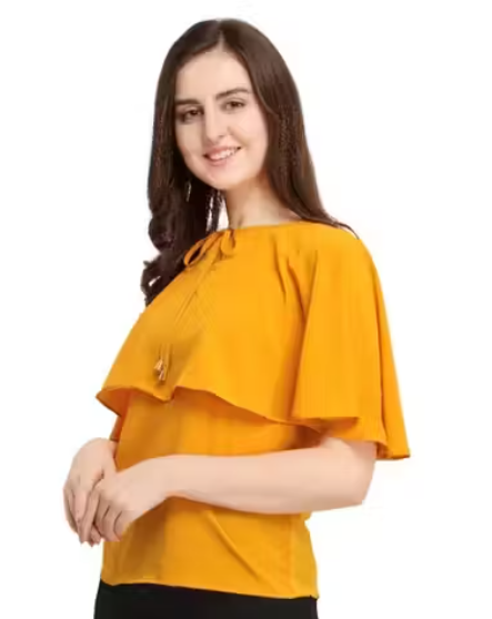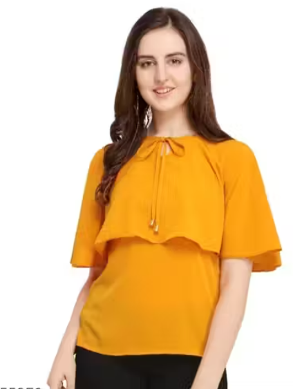 This yellow poly crepe top is a perfect blend of style and comfort. Featuring three-quarter bell sleeves and tie-up detailing, it adds a playful, trendy touch to your casual wardrobe. The solid color and round neck make it versatile for pairing with jeans, leggings, or skirts. Lightweight and soft, this top is ideal for daily wear, casual outings, or small gatherings.