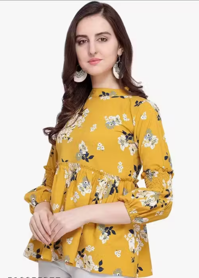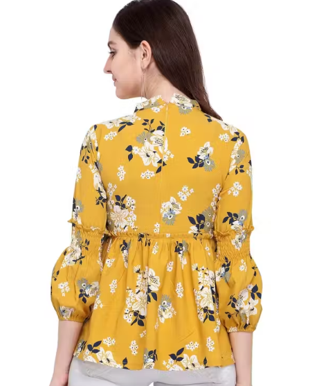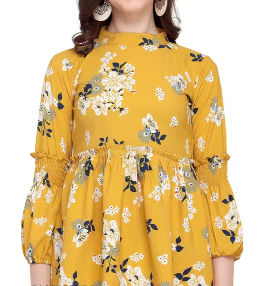 This yellow poly crepe top combines style and comfort in a casual, everyday design. Featuring three-quarter bell sleeves with tie-up detailing, it adds a playful and trendy touch to your outfit. The floral print and round neck make it versatile for pairing with jeans, leggings, or skirts. Lightweight and soft, this top is perfect for casual outings, meetups, or home wear.