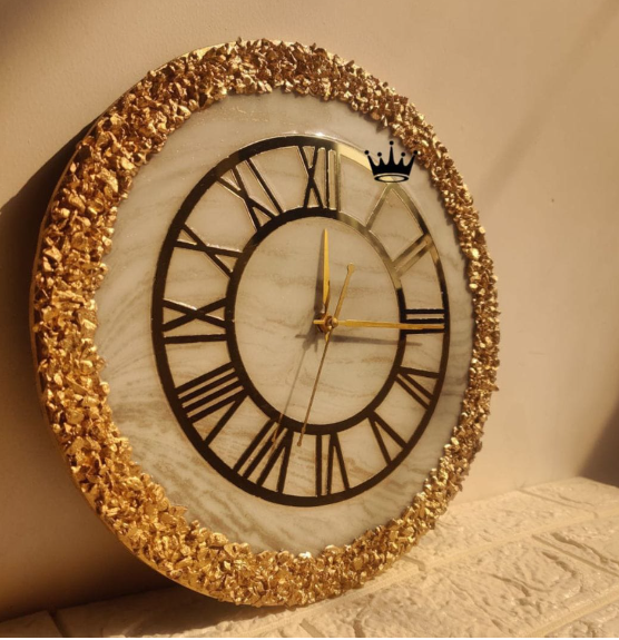 Resin Handmade White Golden Color With Golden Stone Wall Clock