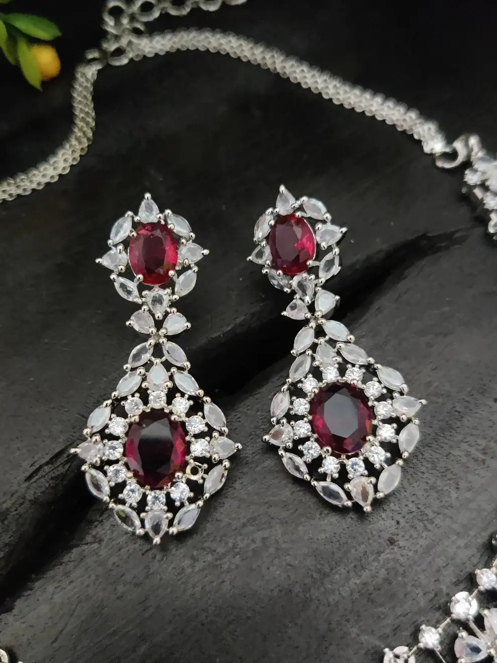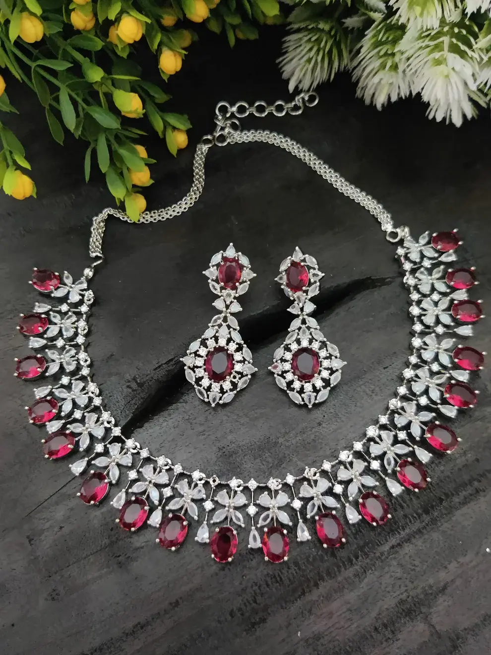 Rhodium Plated Maroon Cubic Zircon Necklace set