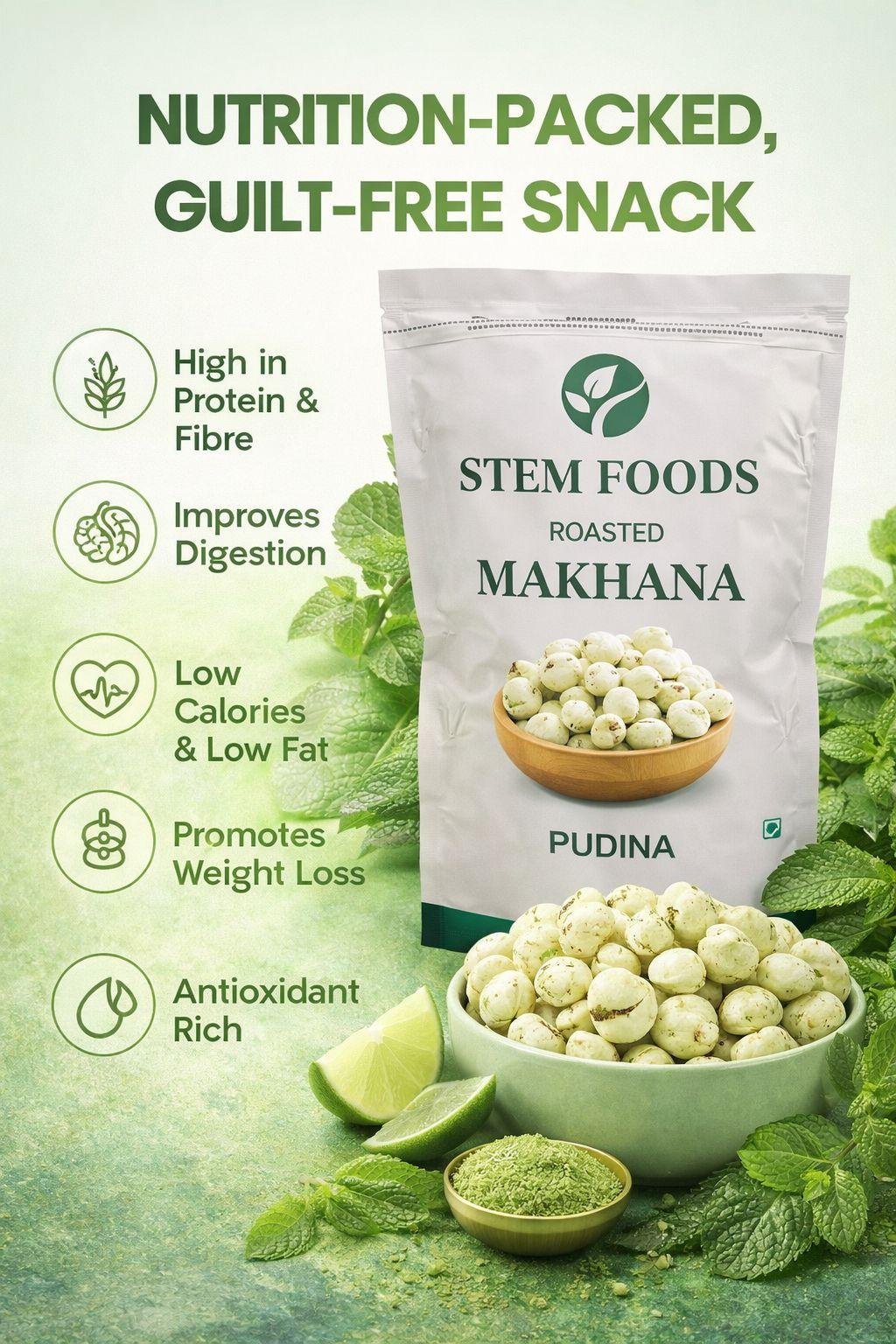 A deliciously healthy snack, roasted pudina makhana combines the light crunch of fox nuts with a refreshing mint flavor. Packed with protein and fiber, this guilt-free snack supports digestion, promotes weight management, and is low in calories and fat. Rich in antioxidants, it’s perfect for mindful snacking anytime. Carefully roasted and seasoned for maximum taste, this makhana offers a wholesome balance of flavor and nutrition in every bite.