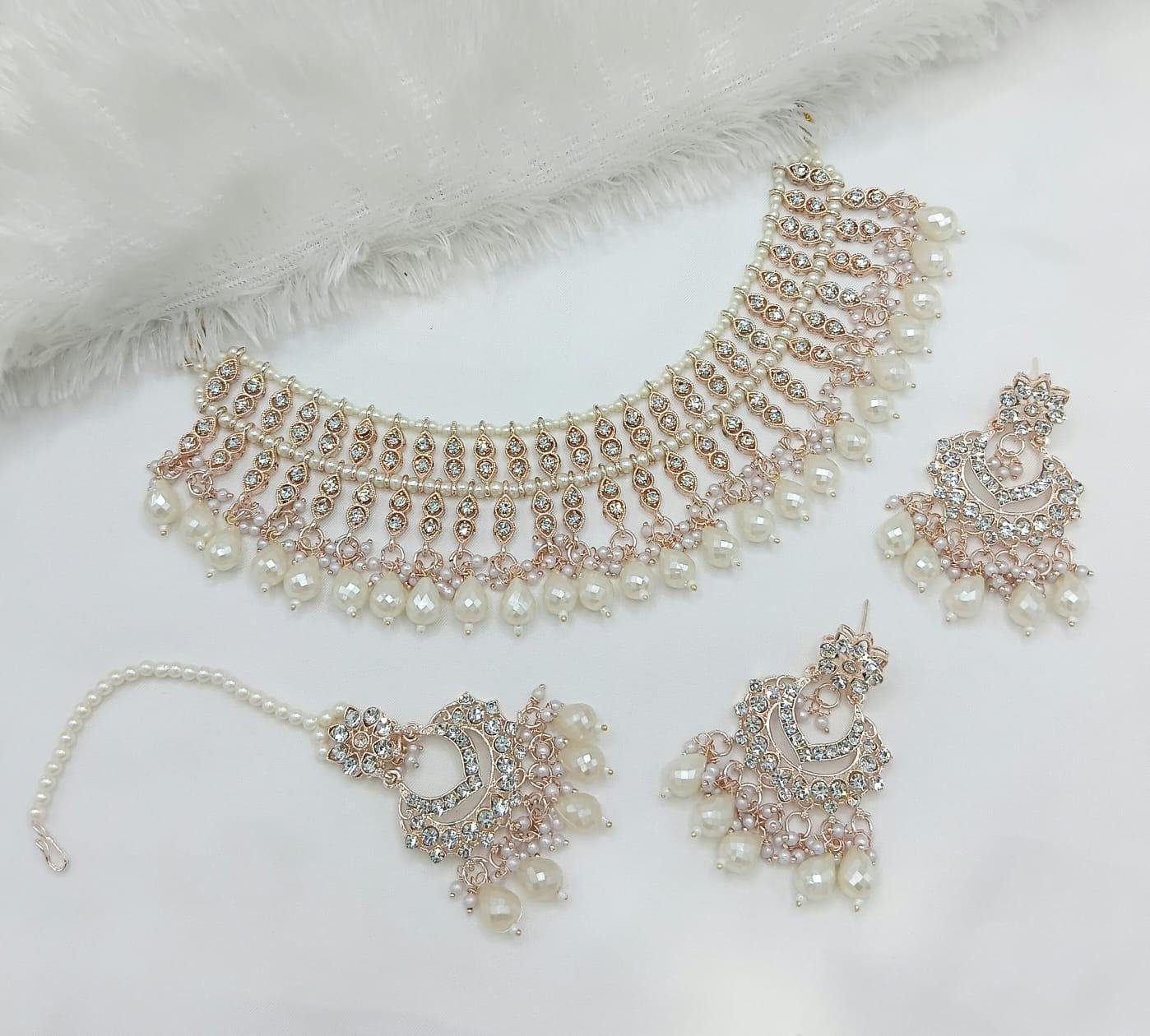 Rose Gold Finish Necklace Set With Stone And Pearl Work