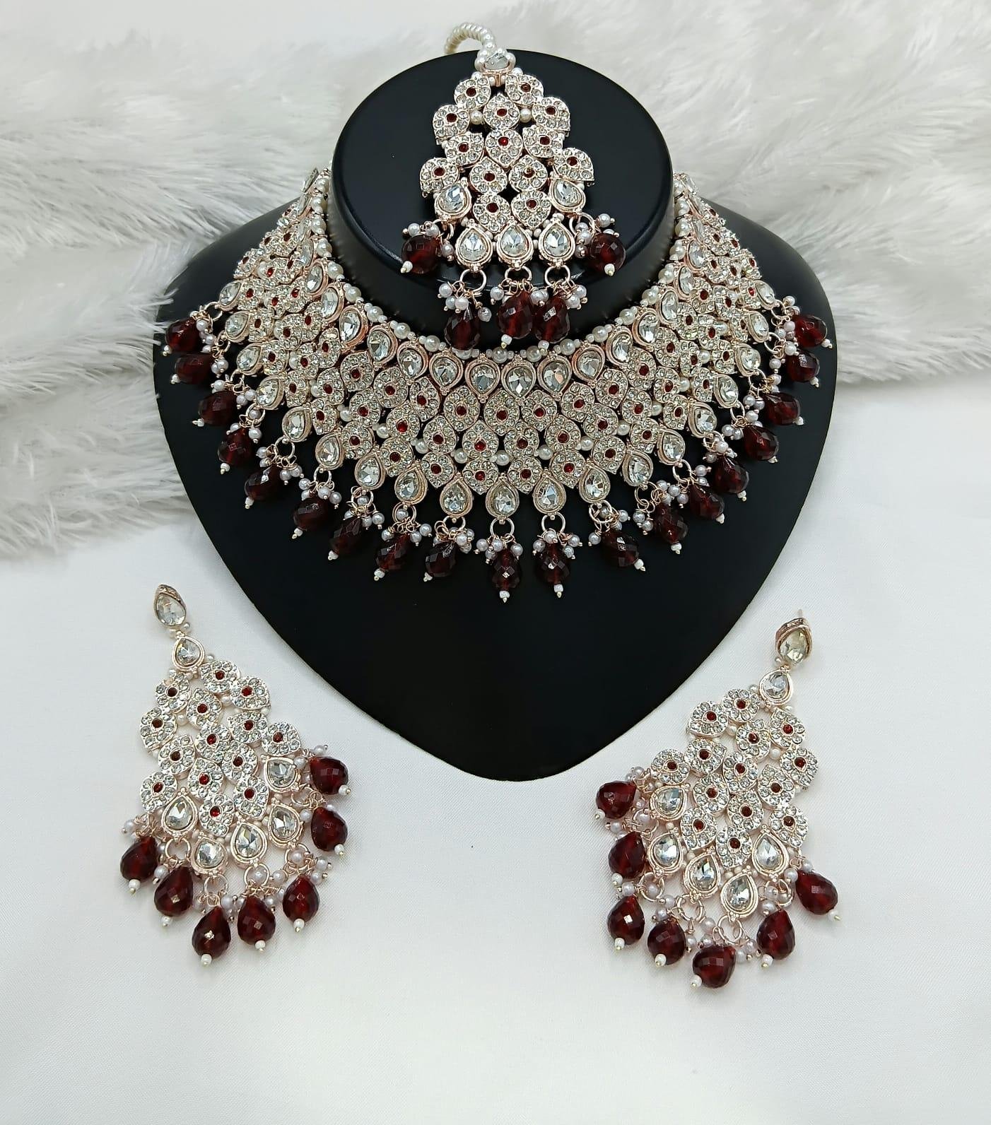 The Ruby Noor Kundan Bridal Necklace Set is a stunning expression of royal elegance and traditional craftsmanship. This exquisite set features a broad choker-style necklace adorned with intricately set kundan stones, highlighted by deep ruby-red accents and sparkling crystal detailing. The rich red bead drops add depth, movement, and a regal finish to the design. Paired with matching chandelier earrings and a beautifully coordinated maang tikka, this set is perfect for brides and special occasions such as weddings, receptions, and festive celebrations. Its luxurious design reflects timeless heritage with a bold, majestic appeal.