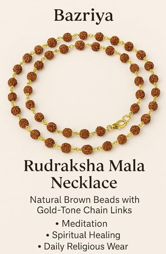 - AUTHENTIC DESIGN: Natural Rudraksha beads carefully strung together with gold-toned metal links to create a traditional prayer mala necklace