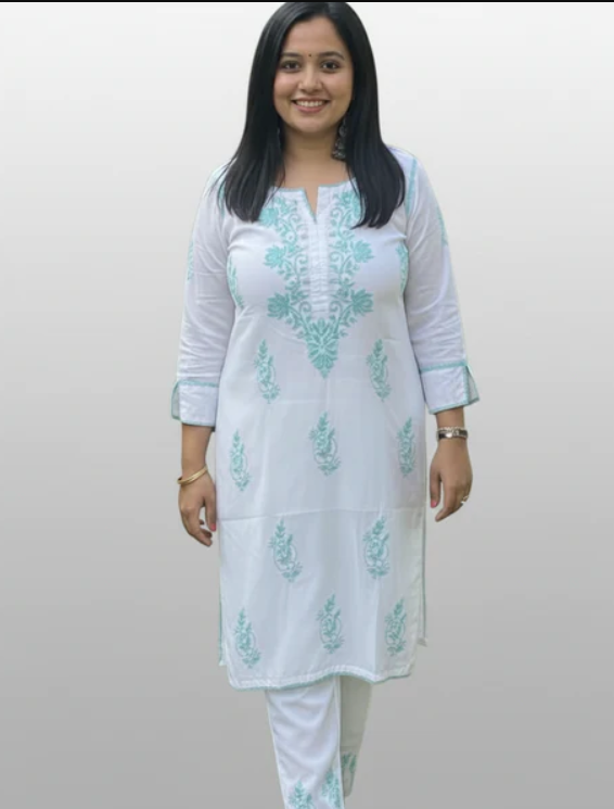 RUHANI Teal Pure Mul Cotton Chikankari Kurti and Pant Set