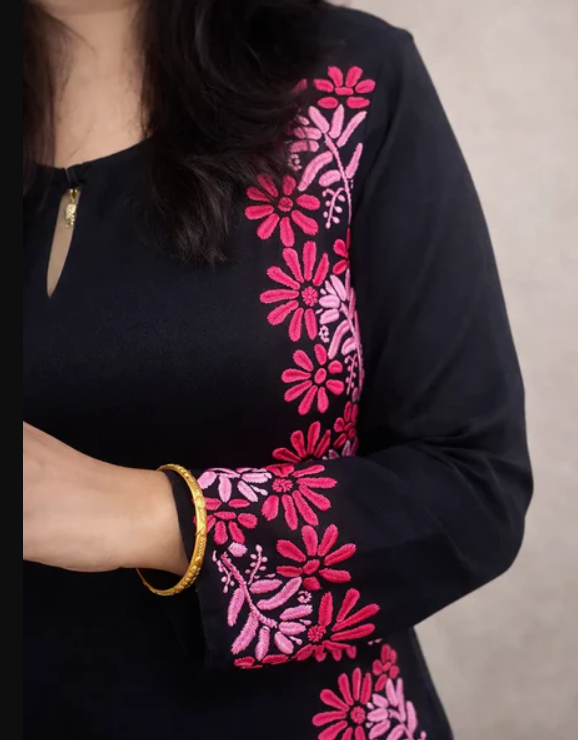 Black Modal Chikankari Kurti with Pink Hand Embroidery