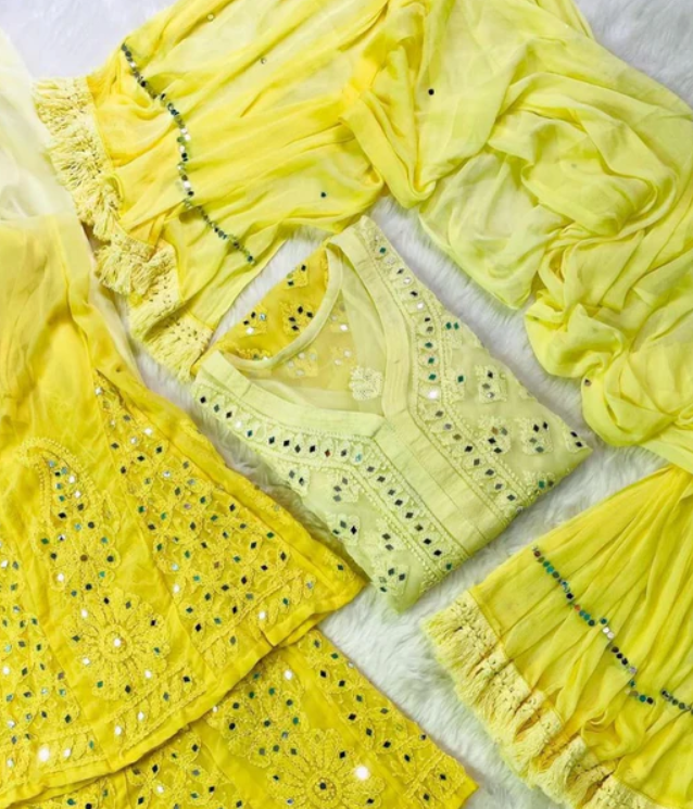 SAPNA Yellow Mirror Work Chikankari Kurta Palazzo Dupatta Set