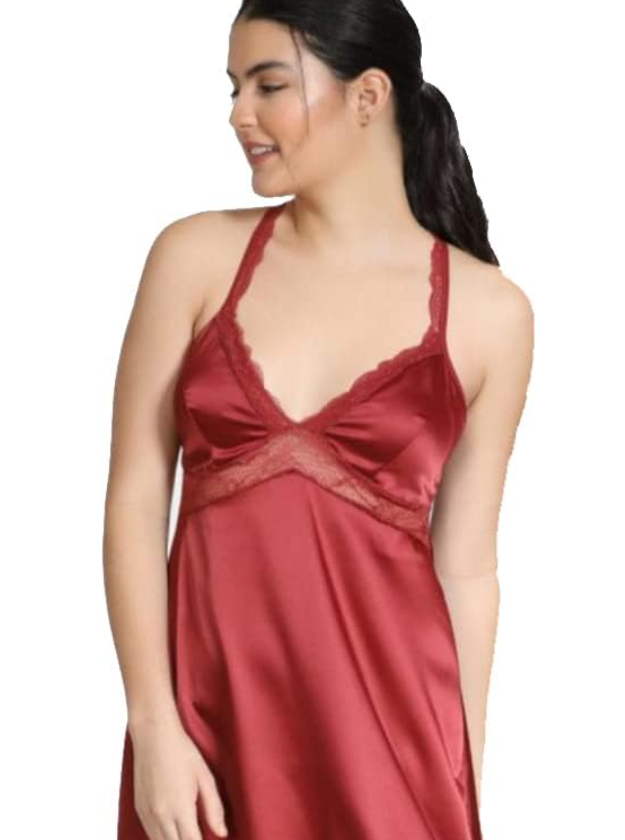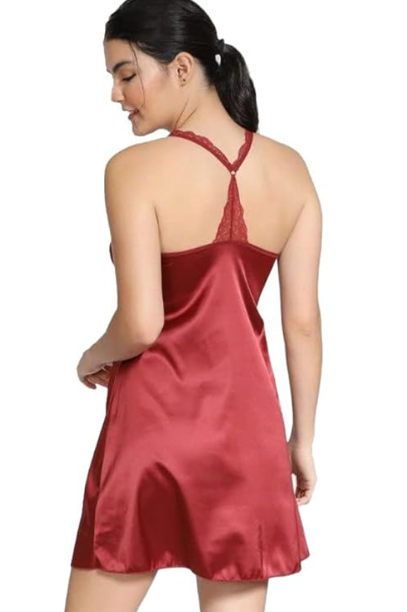 Satin Nightdress with Lace Trim, V-Neck, Racerback Design, Burgundy Red with Free Panty