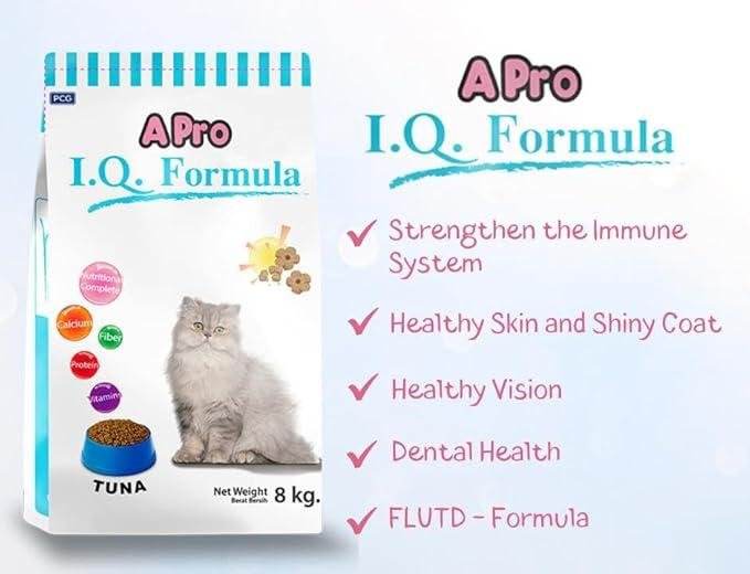 A Pro I.Q. Formula understands what your cat needs. We developed a new recipe that is specially mixed with nutritional value from a balanced blend of vitamins, minerals, and other essential nutrients for all cats. APro I.Q. Formula is also formulated to meet or surpass the nutritional levels established by the US National Research Council (NRC) and the Association of American Feed Control Officials (AAFCO) for cats. Essential Benefits: ✔️Dental Health - Crunchy texture of kibbles help to reduce plaque build-up and whiten teeth. ✔️Healthy Vision - Contains Taurine and Vitamin A which are essential for nourishing your cat's vision. ✔️Immune System - Contains Antioxidant-rich nutrition, Vitamin E and Selenium which help strengthen the immune system. ✔️Healthy Skin and Shiny Coat - Contains Omega-6 fatty acids and Zinc which help maintain healthy skin and shiny coat. ✔️FLUTD Formula is developed to help lower the risk of FLUTD (Feline Lower Urinary Tract Disease) and bladder stone.