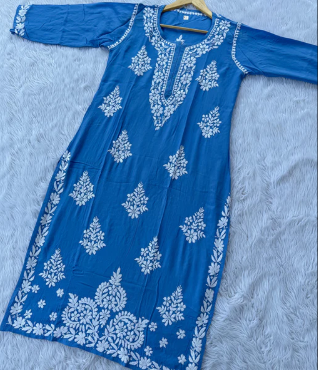 - ✨ Handcrafted Chikankari Work: Intricate white thread embroidery enhances the blue fabric with timeless charm.
