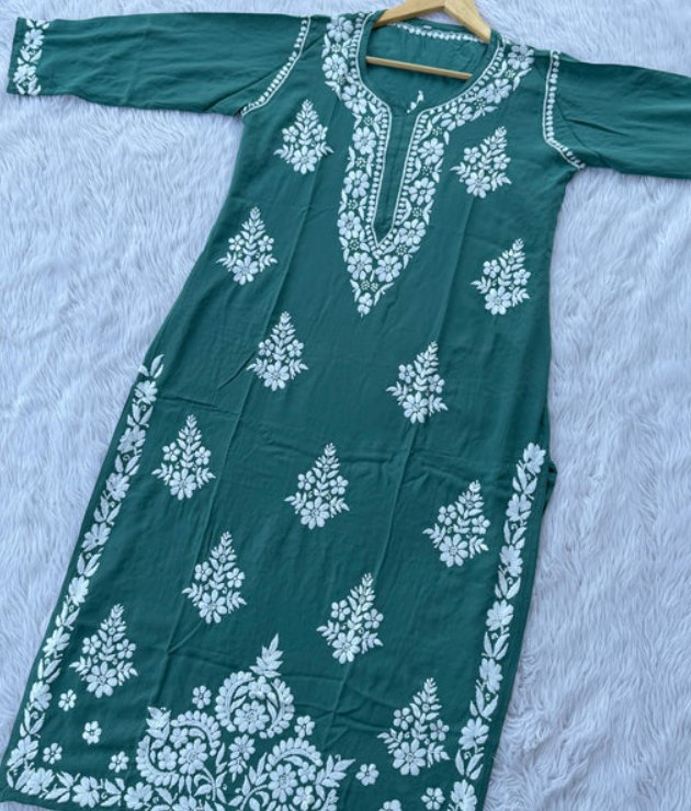 - ✨ Handcrafted Chikankari Work: Intricate white thread embroidery enhances the teal fabric with timeless elegance.