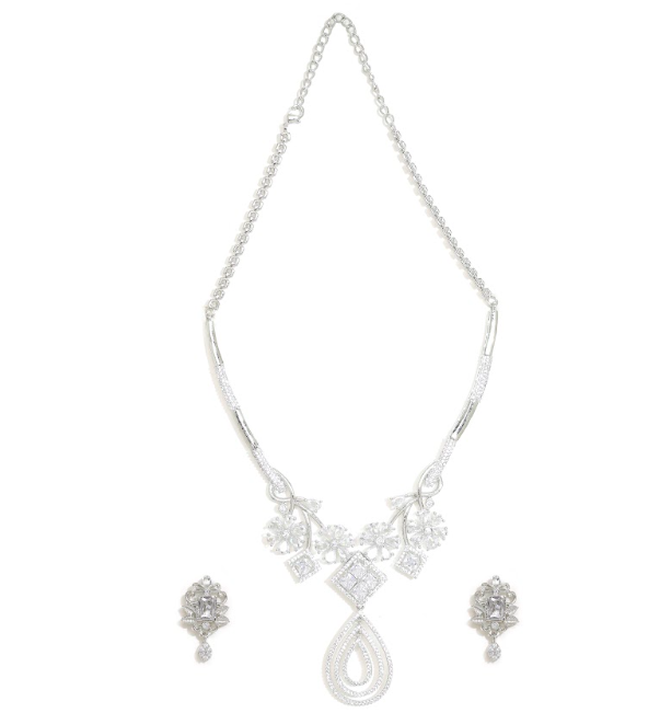 Silver American Diamond Collar Bone Necklace Set With Matching Earrings