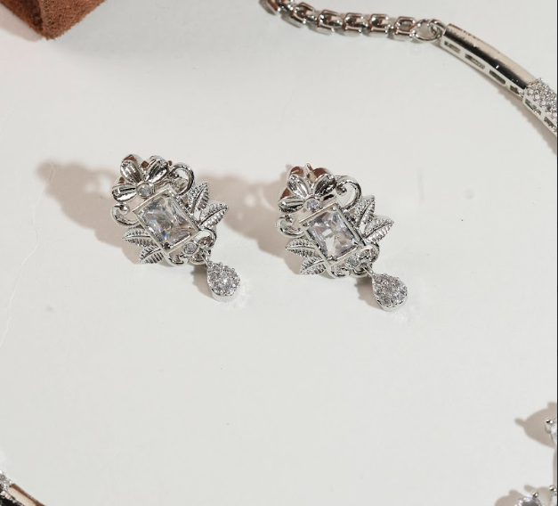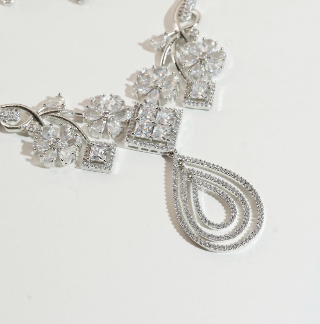Add a touch of modern elegance to your look with this Silver American Diamond Collar Bone Necklace Set. Designed to sit beautifully along the collar bone, the necklace features sparkling American diamonds set in a polished silver finish for a refined, luxurious appeal. Paired with matching earrings, this set is perfect for parties, weddings, receptions, and evening occasions. Lightweight and comfortable, it complements gowns, sarees, and contemporary outfits effortlessly.