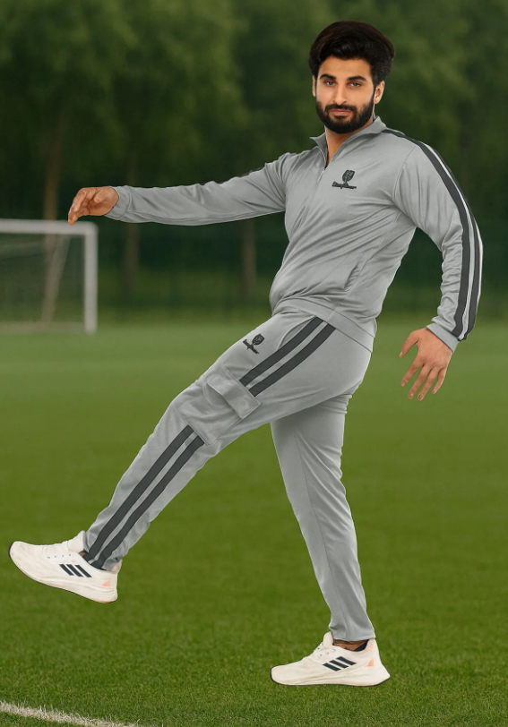 Silver Lycra Blend Polyester Blend Zip Solid Track Suit For Men
