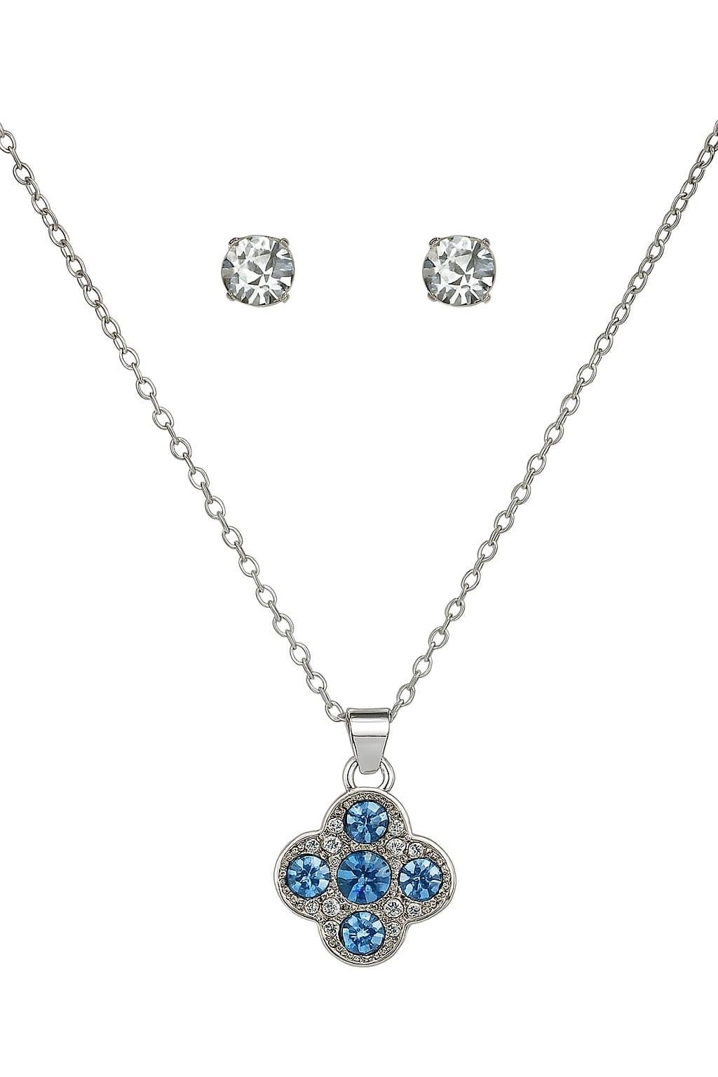 Silver Plated Cz Studded Anti Tarnish Blue Clover Necklace Set