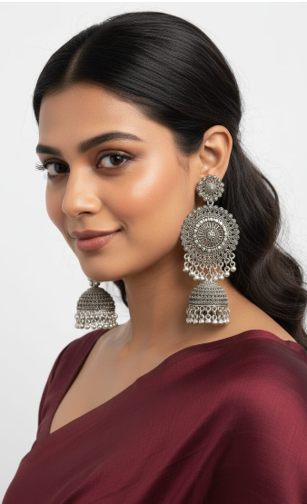Silver-Plated Oxidized Traditional Floral Jhumka Earrings ✅