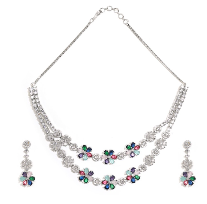 Silver-Tone Floral Crystal Necklace & Earrings Set with Multicolour Stones