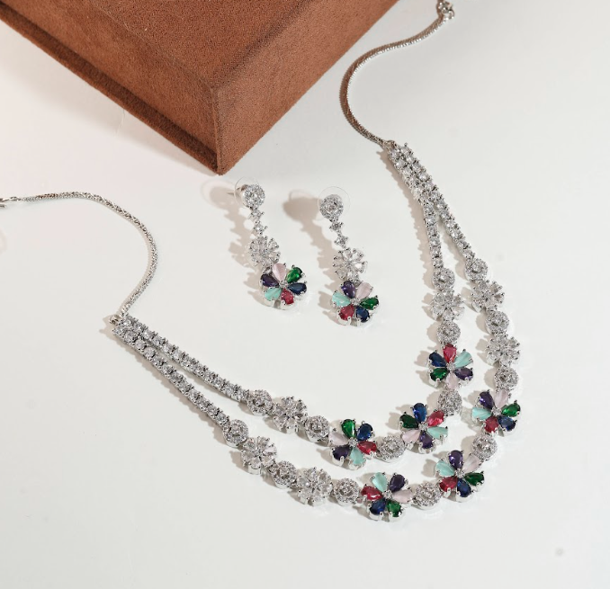 Add vibrant charm to your jewellery collection with this stunning Silver-Tone Floral Crystal Necklace & Earrings Set. Designed with sparkling crystal accents and beautifully arranged multicolor floral stones, this set brings a perfect blend of elegance and playfulness. The layered necklace design enhances its statement appeal, while the matching drop earrings complete the look with graceful balance.