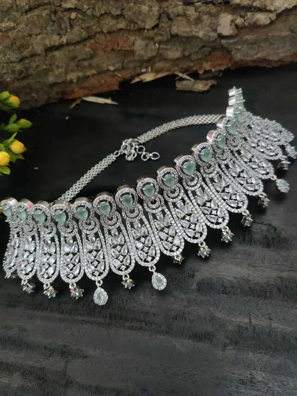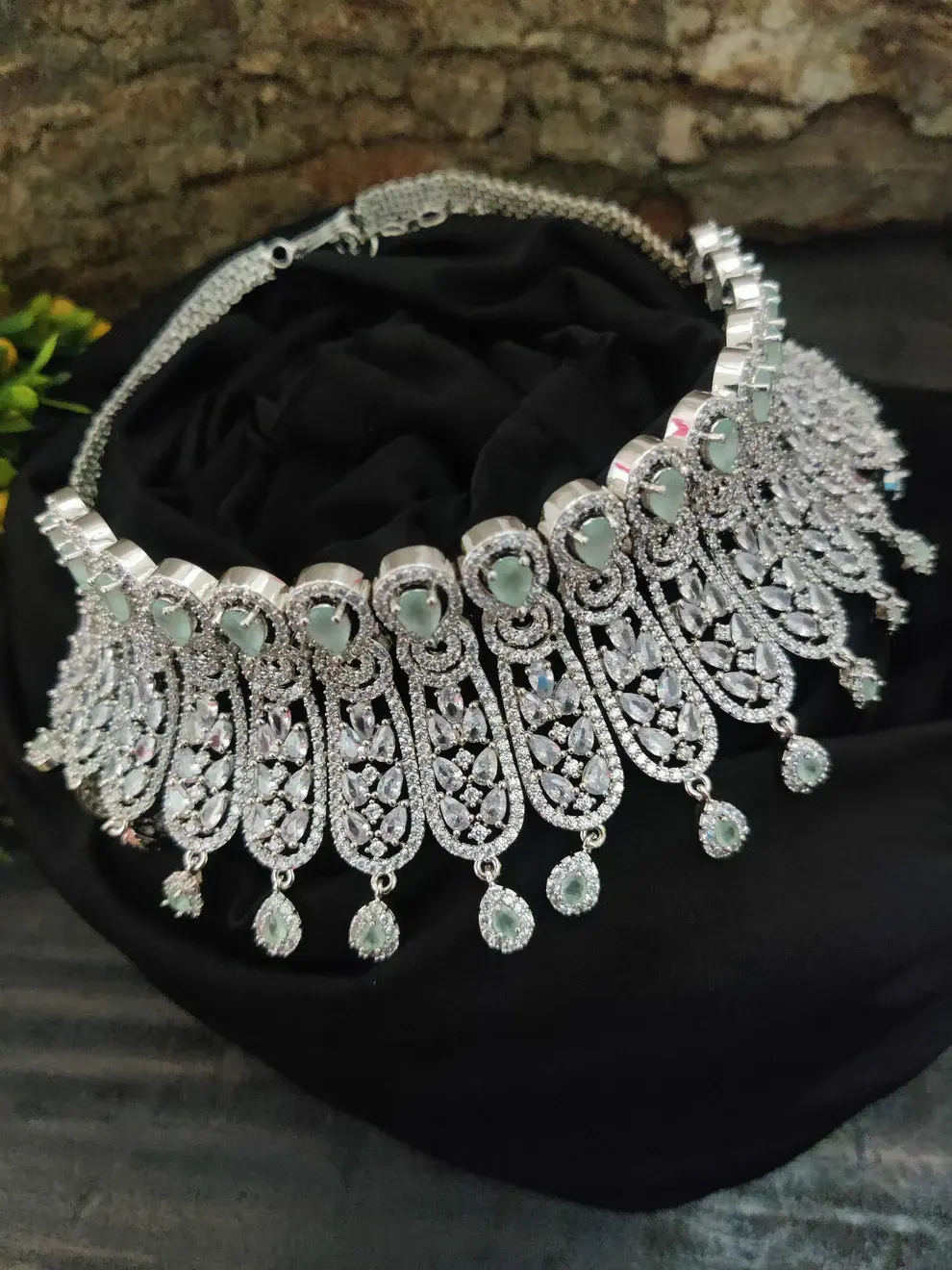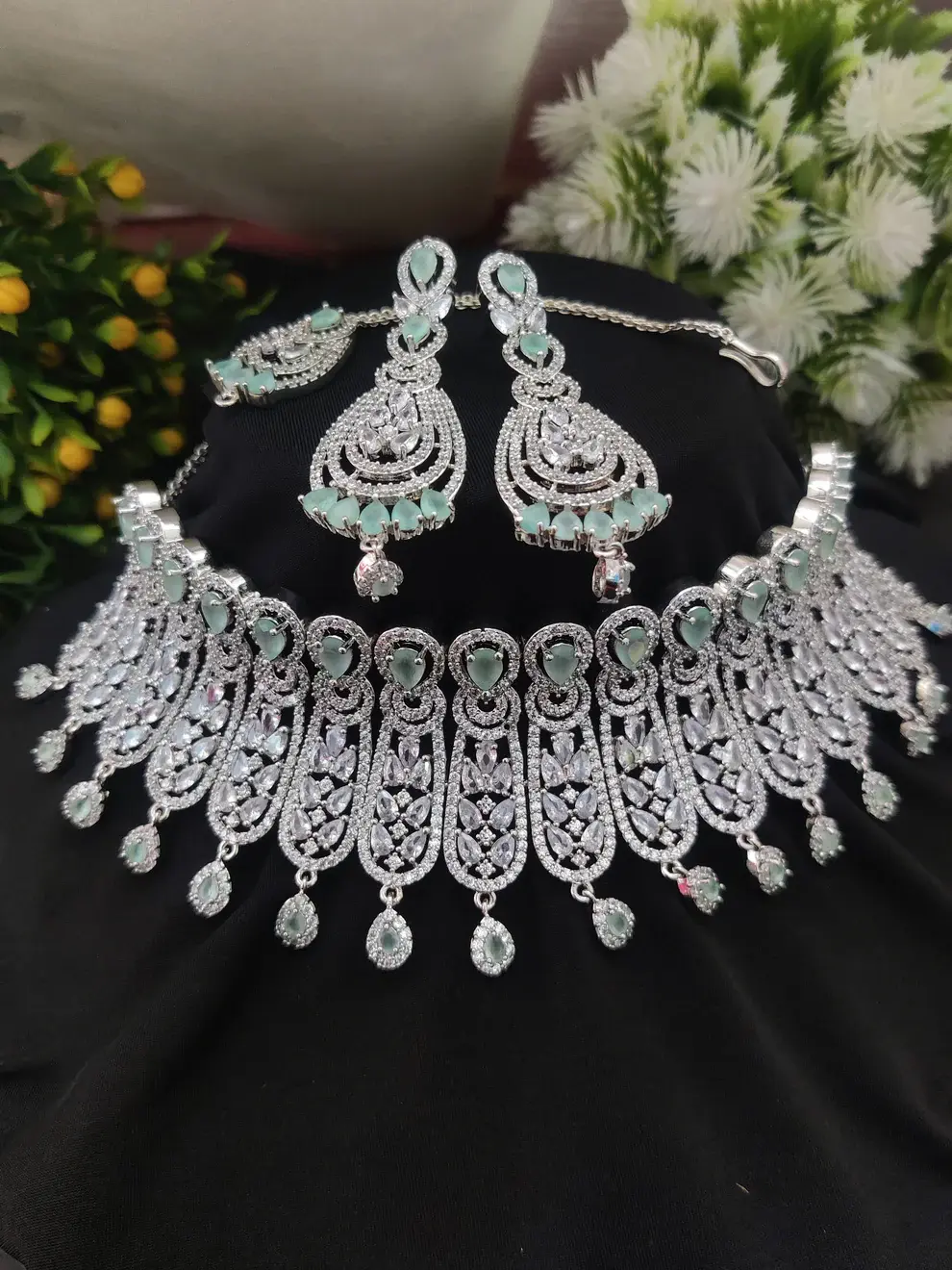✨ Silver-Toned Mint & White Zircon Choker Necklace Set ✨