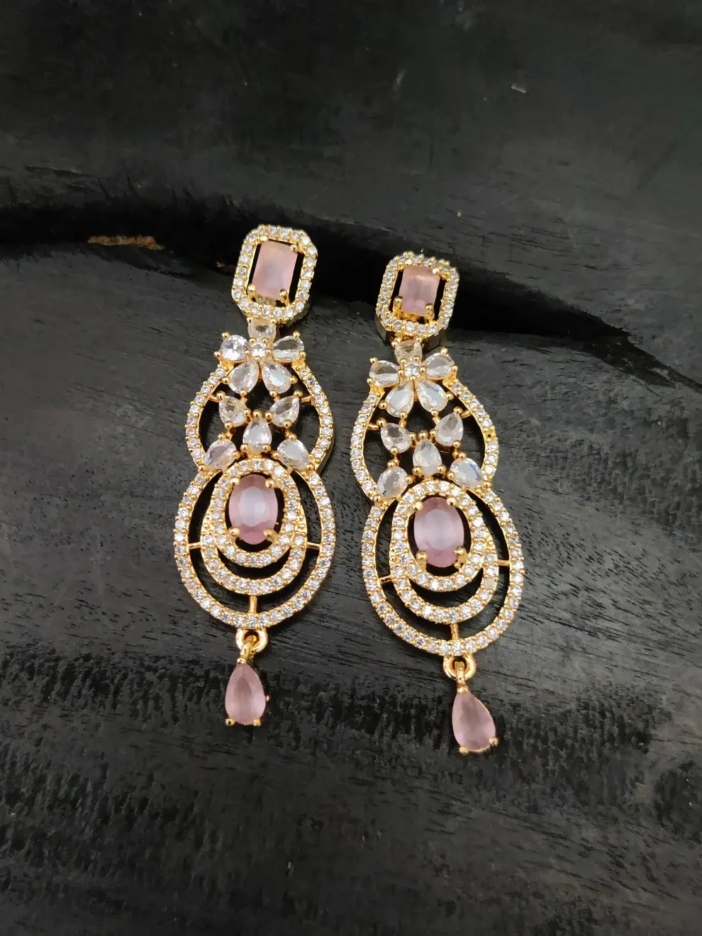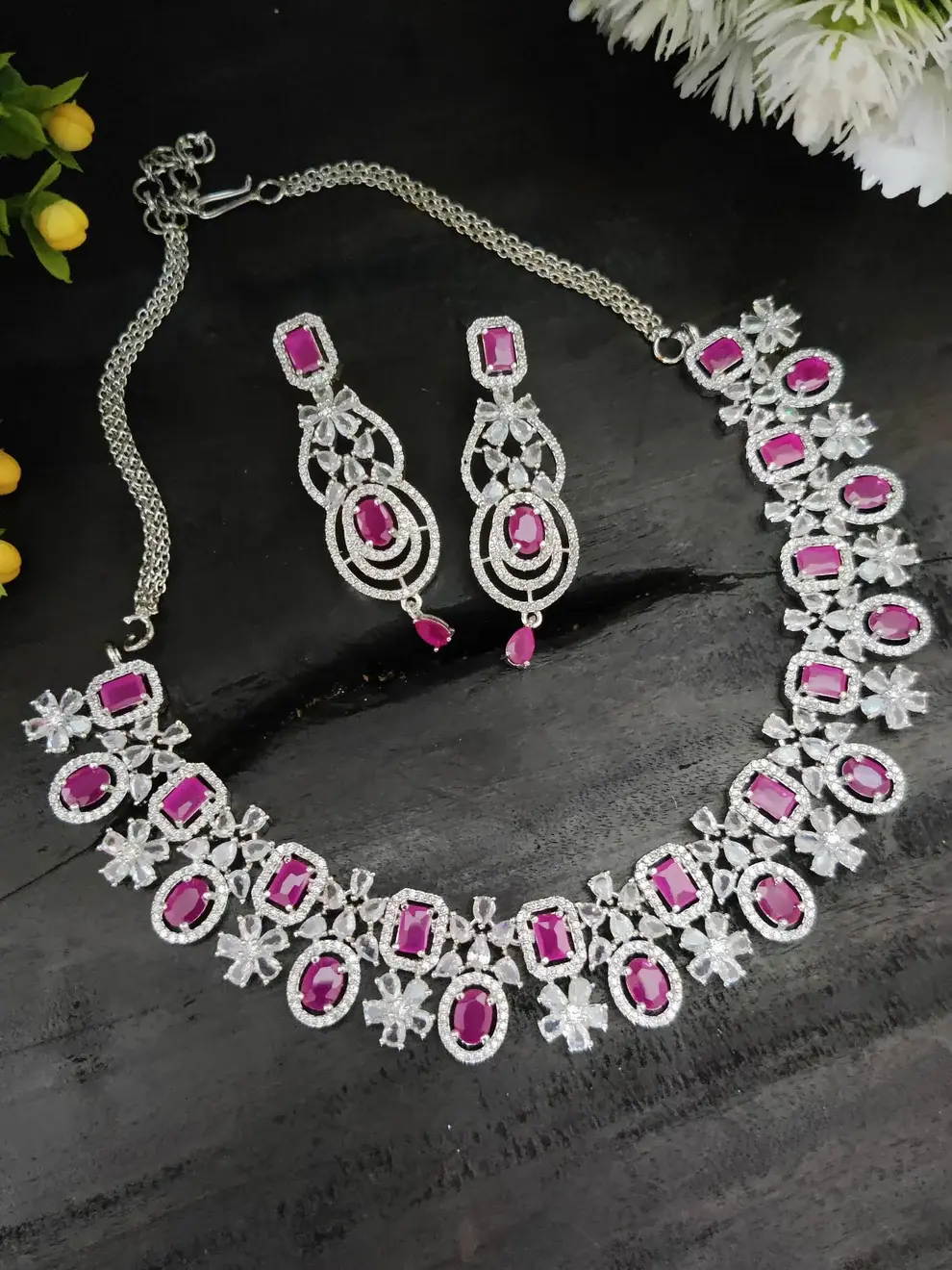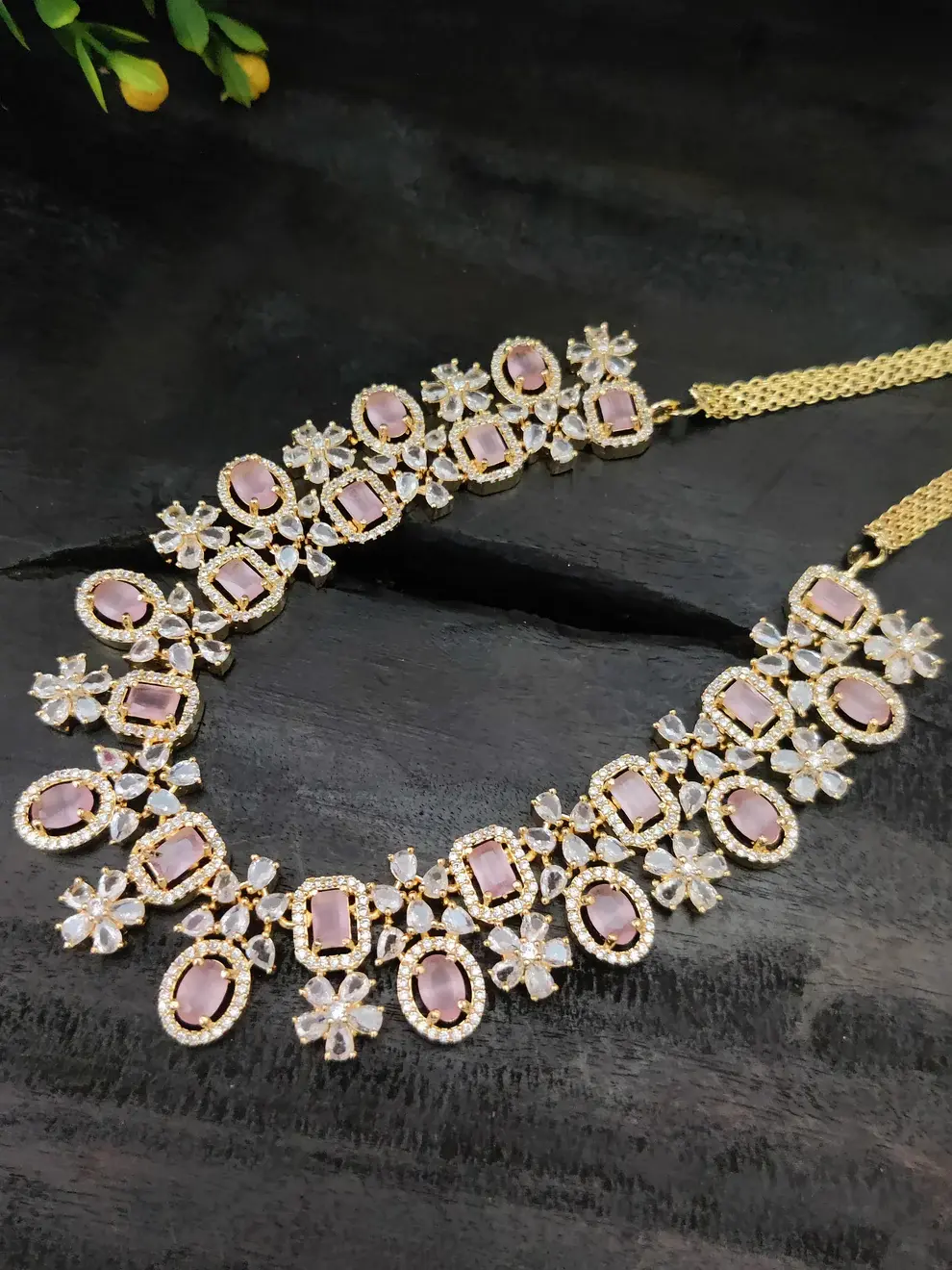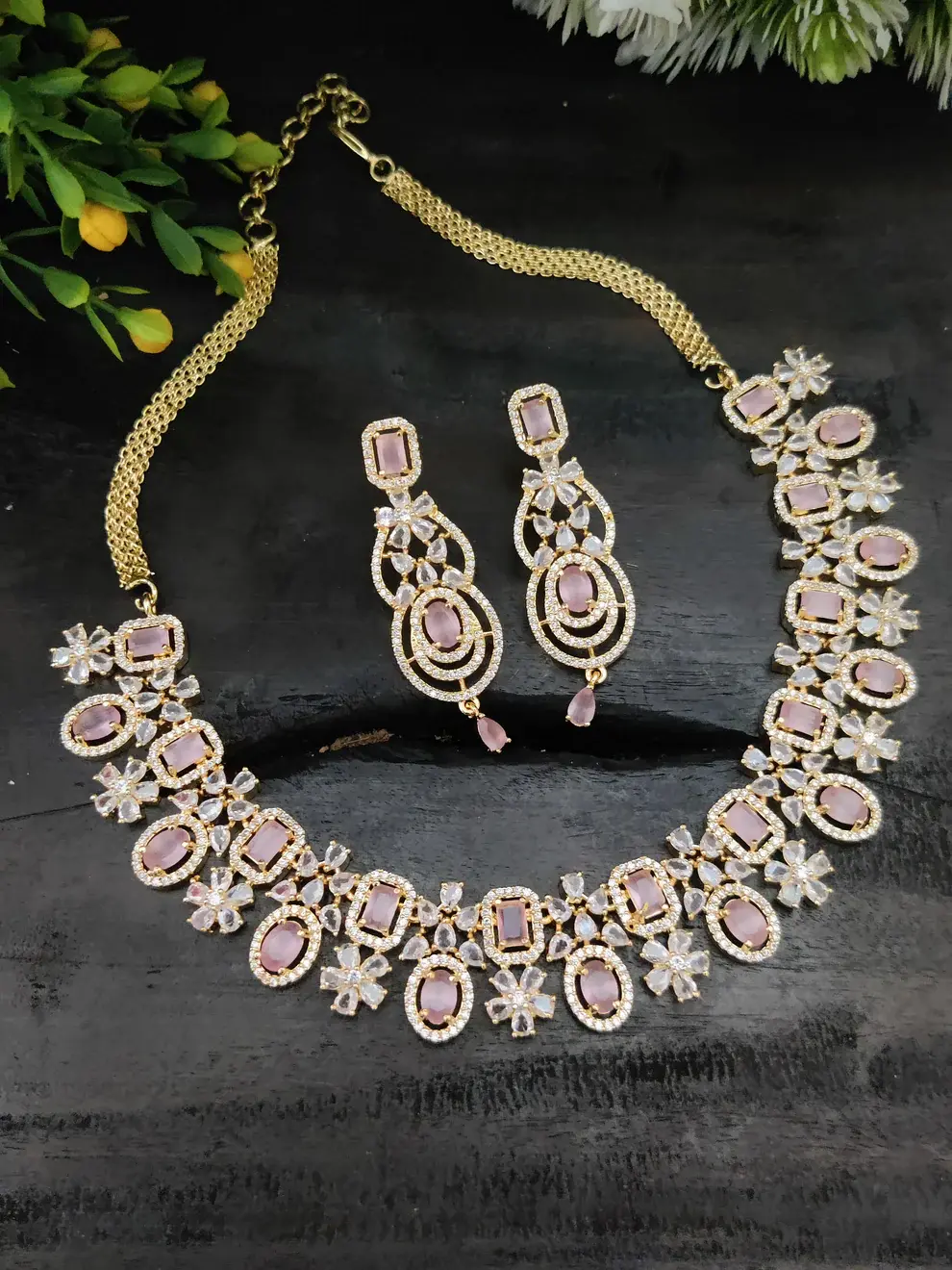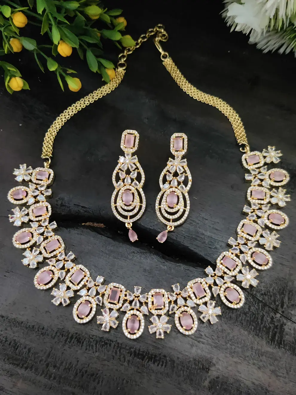 Add a touch of elegance and charm to your look with this Yellow Gold Plated Necklace Set, featuring sparkling pink cubic zirconia stones. Perfect for weddings, parties, festive occasions, or gifting, this set includes matching earrings for a complete stylish ensemble.