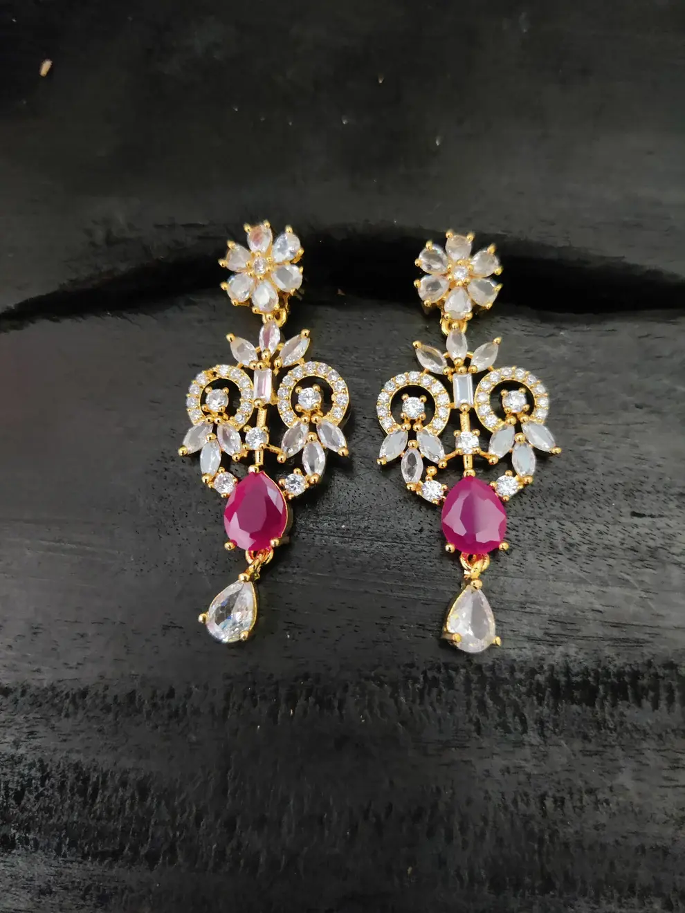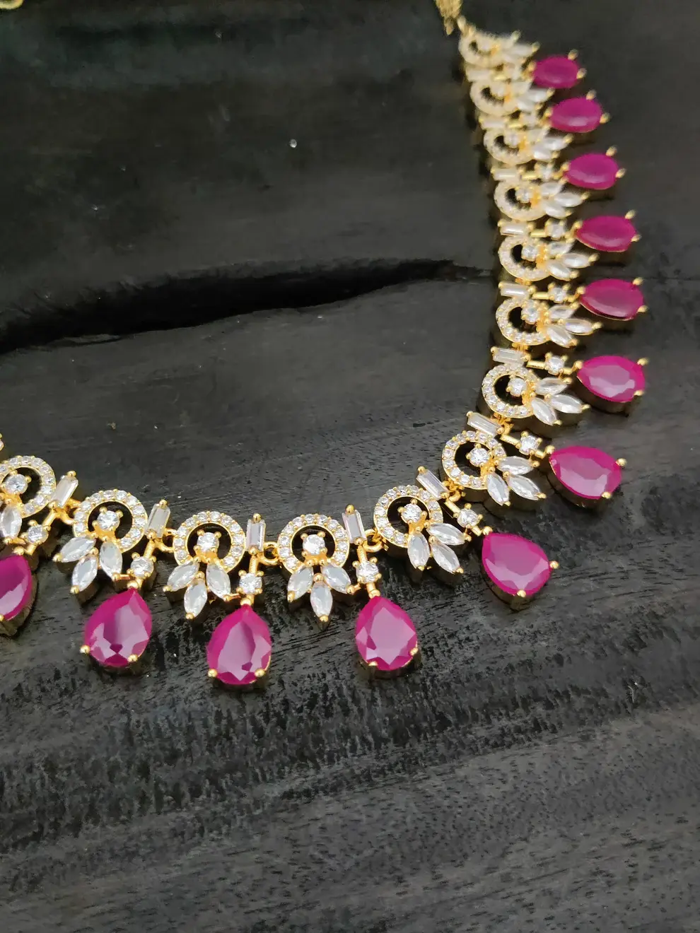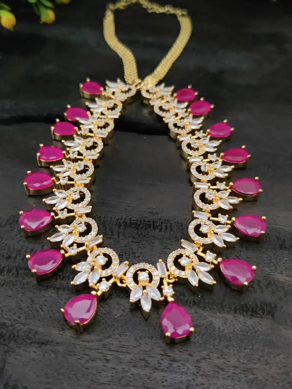 Add a regal touch to your look with this Yellow Gold Plated Necklace Set, adorned with dazzling ruby cubic zirconia stones. Perfect for weddings, parties, festive occasions, or gifting, this set includes matching earrings to complete your elegant ensemble.