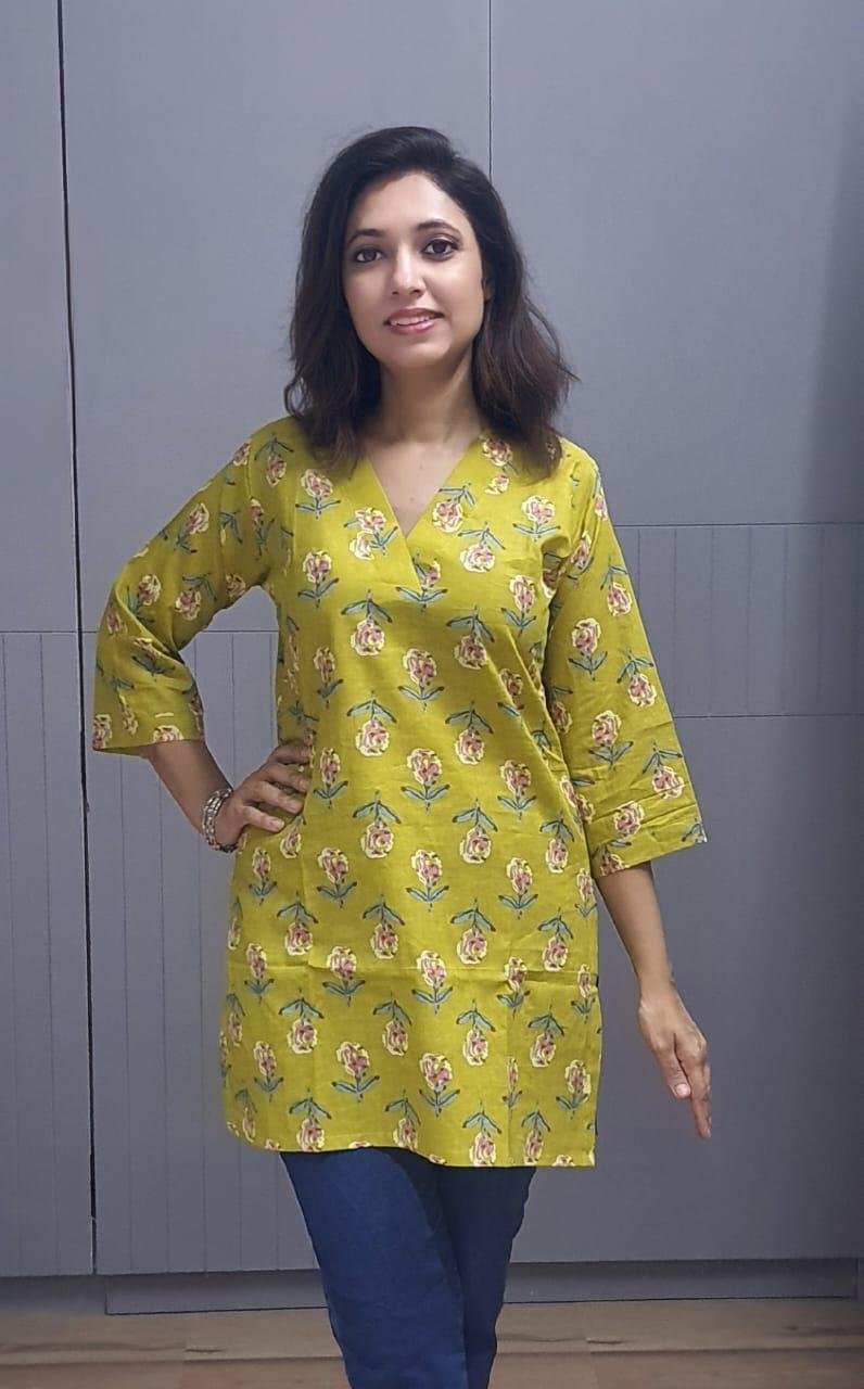 This tunic is made of pure cotton cambric fabric which gives excellent look. It has 3/4th sleeves with side slit. It has V neck patti pattern.